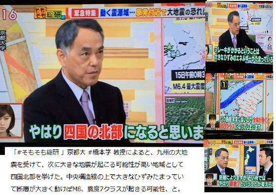 | 2401 Date: 2017-01-27 (Fri) 熊本地震の影響が四国北部に?力学を学ぼう ツイッターに京大の橋本教授が中央構造線の地震を解説したメディア映像が載っていました。 「#そもそも総研 」京都大 #橋本学 教授によると、九州の大地震を受けて、次に大きな地震が起こる可能性が高い地域として四国北部を挙げた。中央構造線の上で大きなひずみがたまっていて断層が大きく動けばM8、震度7クラスが起きる可能性、と。