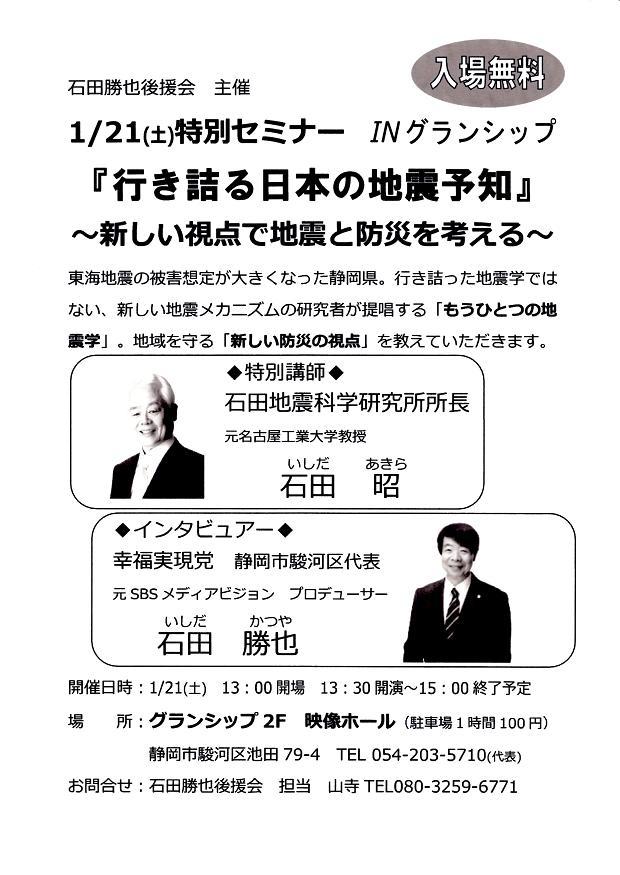 | 2396 Date: 2017-01-15 (Sun) 政党関係者が開催するはじめての新・地震論セミナー 幸福実現党静岡県本部の特別セミナー 『行き詰まる日本の地震予知』〜新しい視点で地震と防災を考える〜 の講師として呼ばれました。 1月21日(13:30〜14:50)静岡市のグランシップで開催です。 開催の趣旨: ーーーーーーーーーーーーーーーーーーーーーーーーー ようやく、政党関係者が「地震爆発論」の重要性に気付いてくれたようです。 これまでにも複数の国会議員、政党関係者に「既成の地震論には矛盾がある」という情報を送ってきましたが、関心を寄せる政党関係者はありませんでした。 現状では何の役にも立っていない既成の地震論の見直しを、逸早く政治家が先頭に立ってリードして欲しいものです。 |