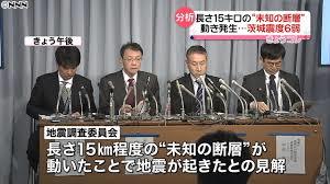 「地球温暖化詐欺」だけじゃなく、「振り込め詐欺」だとかいろんな詐欺行為がはやっていますが、地震学者は「活断層詐欺」という不名誉な行為に加担したと言われるだろうことを予言しておきましょう。 勿論発表している地震調査委員会の平田直教授にも「活断層に関する公開質問状」を送ってあります。数十人の地震学者に送ってありますが、誰からも回答はありません。 ところで、熊本地震の後で以下のような報道がありました。 「国の地震調査委員会は熊本地震を受けて、大地震の発生直後は「余震」という言葉を使わないなど、これまでの発表で使っていた表現方法を変えることを決めました。 気象庁は、4月の熊本地震で当初、本震とみられていた地震が起きた翌日に「3日以内に震度6弱以上の余震が発生する確率は20%」と発表しました。しかし、実際には2日後に震度7のさらに大きな地震が起きました。」 これは、地震直後には「余震」という表現を使用しない、というだけのことなのでしょうか。しばらくは「本震」があるかも知れない、あったらまた追求される、だから、保身の術を使っておこう、ということなんでしょう。何時までを「直後」というのか曖昧です。 要するに地震の真相は何も分りませんということでしょう。 追記:(2017年1月25日) 上記のビデオ発表は削除されてしまいました。”ユーザーが削除”と表示されますが、文科省側が削除したのでしょう。 ![]() クリックすると動画のある記事に移動します 28日に茨城県で発生した最大震度6弱の地震について、政府の地震調査委員会は、長さが15キロ程度の未知の断層が動いた、との見解を示した。 28日夜、茨城県高萩市で震度6弱を観測した地震では、窓ガラスが割れたりする被害が出たほか、2人がケガをした。地震調査委員会は29日、臨時の会合を開いて活動を分析し、長さ15キロ程度の未知の断層が動いたことで地震が起きた、との見解をまとめた。28日夜の発生直後に比べて余震活動は低下しているという。 今回の地震は5年前の東日本大震災の余震とみられているが、2004年にインド洋大津波を起こしたスマトラ沖地震では、発生から10年が経過しても周辺で大きな地震が繰り返し起きているため、今後の地震や津波にも注意が必要だとしている。 気象庁の報道も残しておきます。 28日午後9時半過ぎ、茨城県を震源とする地震があり、茨城県高萩市で震度6弱の揺れを観測した。この地震について気象庁は、東日本大震災の余震という見解を示すとともに、今後も1週間程度は同じ規模の地震の発生に注意するよう呼びかけている。 気象庁・青木元地震津波監視課長「揺れの強かった地域では、地震発生から1週間程度は最大震度6弱程度の地震に注意。地震の発生から2、3日後は大きな規模の地震が発生しやすい状況。十分注意していただきたい」 気象庁によると、今回地震がおきた茨城県北部から福島県浜通り地方にかけてのエリアは、5年前の東日本大震災の余震域で、余震とみられるという。このエリアでは震災の翌月にもマグニチュード7の大地震がおきるなど、震災以降、地震活動が活発になっている。 また28日午後9時38分ごろの震度6弱以降も、最大震度4をはじめ、体に感じる地震が繰り返しおきている。東西方向に地面が引っ張られることでおきる正断層型の地震だという。 気象庁は、今後1週間ほどは最大震度6弱程度の地震の発生に注意を呼びかけている。 |