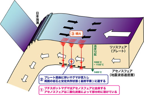 日本海溝沖の北西太平洋に存在するプチスポットと呼ばれる火山で活動したマグマの生成条件を明らかにするために高温高圧溶融実験を行った結果、プチスポットのマグマが、プレート直下のアセノスフェアに由来することを明らかにしました。 ![]() ![]() 図1:本研究で対象とした東北沖のプチスポット周辺の海底地形.....................図6:北西太平洋におけるプチスポット噴火モデル プレートテクトニクスの理論に基づくと、プレートは直下の柔らかい層であるアセノスフェアの上を滑るように移動し、地球深部に沈み込むなどして地球表層で発生する地震・火山活動や造山運動などの原因となっています。つまりアセノスフェアはプレートテクトニクスの根幹を担っており、表層が活発に活動し大陸が存在する太陽系唯一の惑星である地球を特徴づけるものと言えます。そのアセノスフェアが柔らかい理由は、部分的に溶けていることが原因であるとする説と、溶けてはいないとする説が提唱されており、プレートテクトニクス理論が確立された頃から論争が続いていました。今回の成果は、前者のアセノスフェア部分溶融説を強く支持するものであり、地球のプレート運動、さらにはプレート運動によって引き起こされるマントル対流の仕組みを根本的に理解するための重要な条件となります。