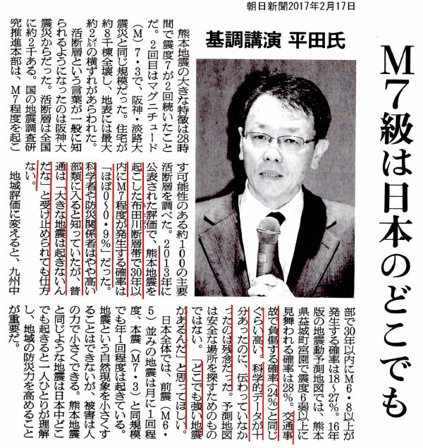 | 2412 Date: 2017-02-17 (Fri) 地震発生確率がウソだと知っている地震学者 本日(17日)の朝日新聞に『21世紀文明シンポジウム「減災と創造的復興〜熊本地震の経験と教訓を踏まえて」』という記事がありました。その中で、東京大学地震研究所地震予知研究センター長の平田直教授が「地震発生確率0〜0.9%は高い部類に入ることは、科学者や防災関係者は知っていた」、「科学的データが充分あったのに、伝わっていなかったのは残念だった」と述べておられ、びっくりいたしました。 ![]() 平田教授のコメントにある「どこでも強い地震があると思って欲しい」と言うのなら、「確率表など出すな」と言いたくなるのが人情 ![]() 「地震の心配が少ない県」という鳥取県のPRを地震学者は“ウソ”だと知っていたという事です。 注: 記事の内容は熊本で開催された以下のようなシンポジウムのようです。 熊本日日新聞2017年02月11日09時14分 「災害に強い」社会へ 熊日復興再生会議が第3回シンポ 21世紀文明シンポジウム「減災と創造的復興 熊本地震の経験と教訓を踏まえて」が10日、熊本市のホテル熊本テルサで開かれた。地震研究者や被災自治体の首長らが震災対応の課題や災害に強い社会の実現について意見を交わした。
