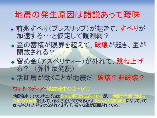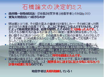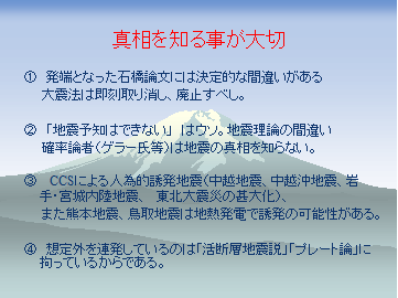 | 2418 Date: 2017-02-28 (Tue) 東海地震の言いだしっぺである石橋神戸大名誉教授は無責任ではないのか 東海地震の言いだしっぺは石橋克彦神戸大名誉教授(当時は東大地震研助手)であったことは有名な話です。 しかし、其の論文の中で解析に使っている測量データが補正の符号を間違えたものであったことが、大震法成立の翌年に開催された「地震学者と地質学者の対話」の中で明らかにされています。(参考[1702]、[2390]など) 1月21日に開催した静岡の特別セミナー([2397])でも紹介しましたが、その件については御本人もメディアも何も報道していません。言いだしっぺの学者としては無責任なのではないでしょうか。 ![]() ![]() 行き詰まる地震予知ppt資料より ![]() 画面をクリックすると動画が開きます 会見では原発震災という用語の発案者とも紹介されていますが、福島原発の事故は津波災害であり、地震による震動災害ではありません。 誠実な地震学者なら、過去の自説が間違っていたことを公表してから、新説を開陳すべきだと思います。 メディアも新説を取り上げる場合には責任ある態度を取っていただきたいものだと思います。 坂本竜馬風に言えば、 衆議院選挙最終日(年金の使い込み) |