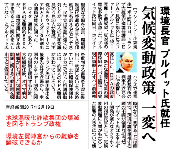 Date: 2017-02-19 (Sun) 「温暖化詐欺」を覆すトランプに習って「活断層詐欺」を覆せ トランプ大統領が環境保護局長官に指名したプルイット氏を米上院が可決したそうです。