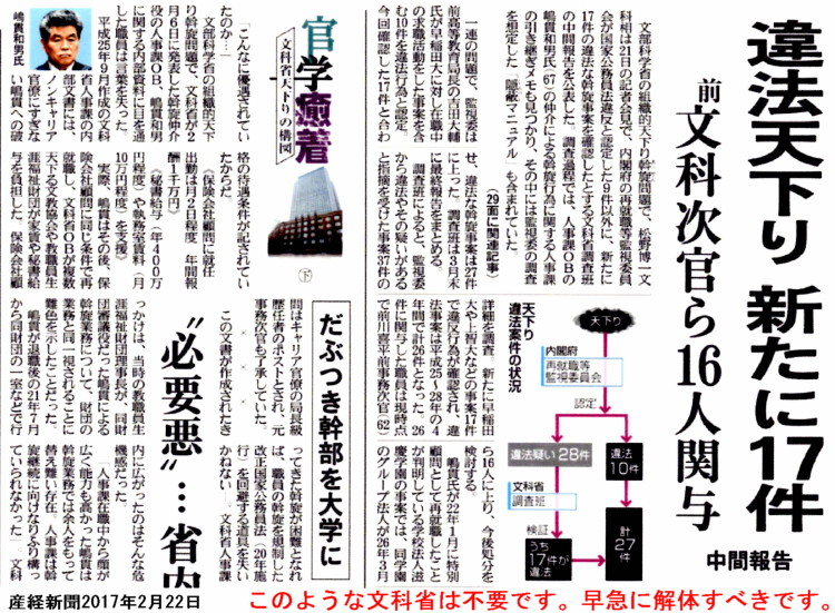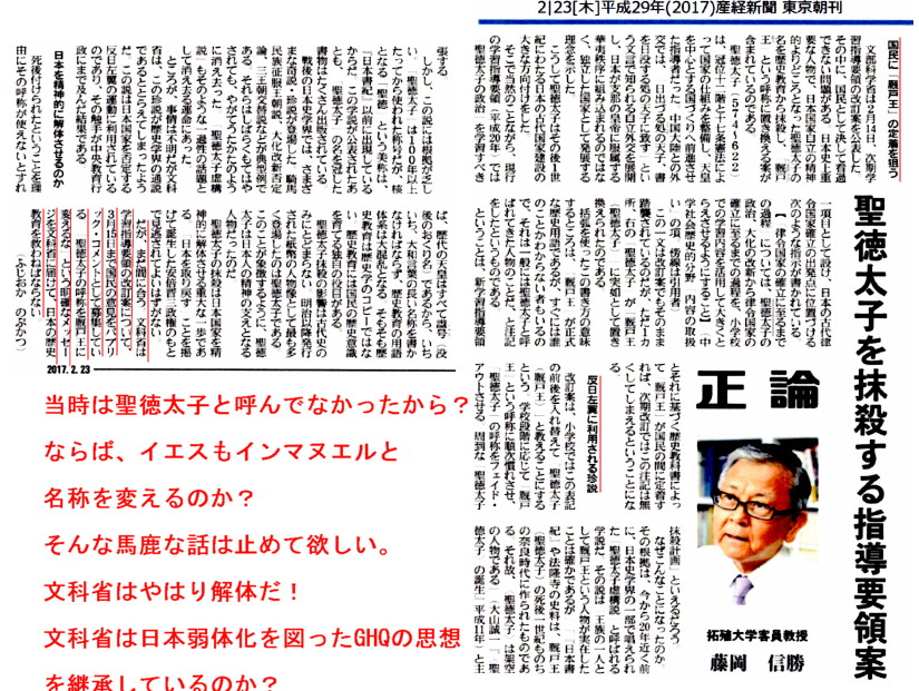 | 2415 Date: 2017-02-23 (Thu) こんな文科省など不必要だ、解体してしまえ! 文部科学省のやっていることは全部信用できない、と述べましたが、今日の産経新聞にはまた一つ信用できない話題が載っていました。 藤岡信勝氏が「正論」で「聖徳太子を抹殺する指導要綱案」という記事を書いています。 国民から尊敬されている聖徳太子の名を「厩戸王」に切り替えようとする企みが「指導要綱」に盛られるという事です。