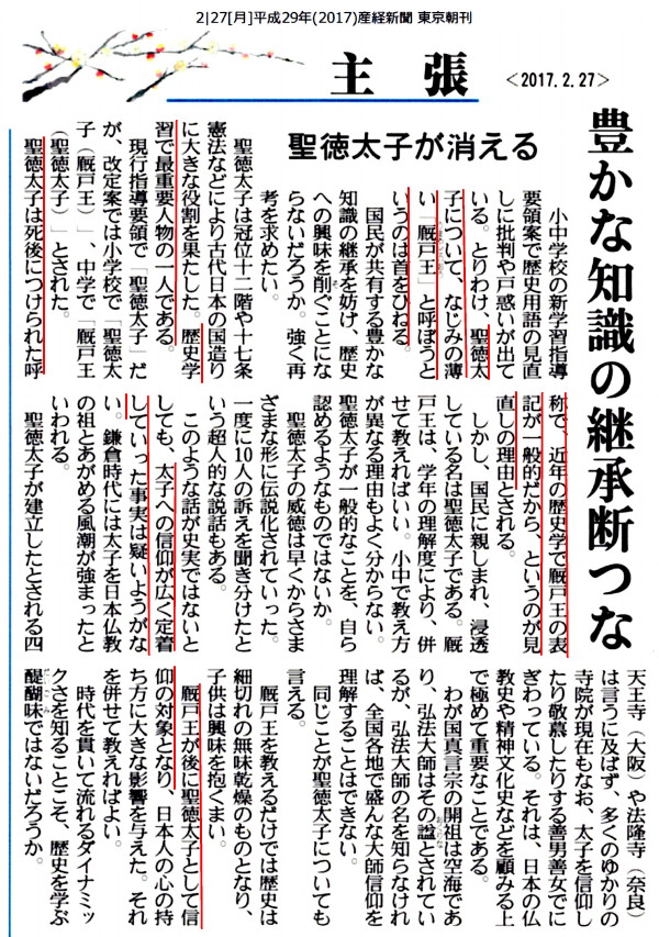 | 2417 Date: 2017-02-27 (Mon) 日本の歴史を貶めようとする文科省を解体せよ 今日の産経新聞「主張」欄にも「聖徳太子が消える」という教科書への危惧が示してあり、強く再考を求めたい、とありました。当然の主張です。