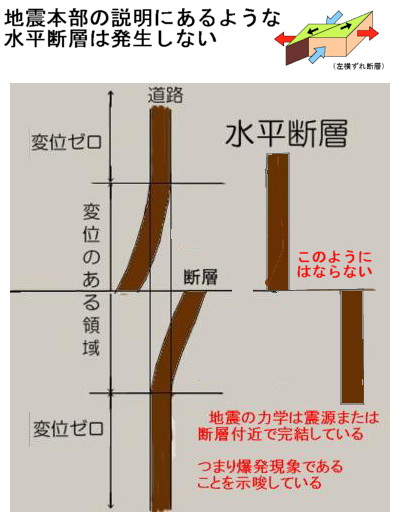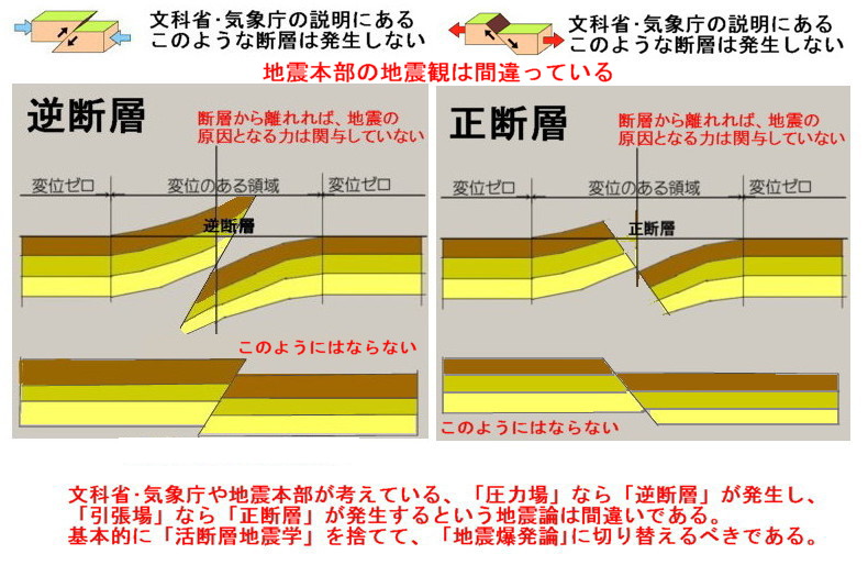 本当にそのメカニズムで起きるのなら、断層の遠くでも変位が生じているはずですが、変位は断層の近くでしか現れません。断層の近辺で「爆発」により、地層が捲くれ上がるように、破断することが本当のメカニズムです。 右ずれ、とか左ずれ、という水平断層についても同じことです。変位は断層の近辺でだけで発生し、断層から離れれば変位はありません。 ![]() “こんにゃく板”を使った実験は相当に悪質です。斜めに切って横から押したら、当然“切れ目”でずれます。こんなものを実験として紹介するのは“詐欺行為”みたいなものです。 2枚の下敷きを使った実験なるものもまやかしです。地殻には下敷きが持っているような弾性はありません。 こんな“まやかし実験”を真面目な顔をして紹介する文科省に学問をリードする資格はありません。 教育の元締めとしての存在意義がありません。地震学の総元締めである東大地震研究所とともに解体しましょう。 ![]() 文部科学省のやっていることは全部信用できない! だぶつき幹部を大学に? 大学を養老院にするつもりか! |