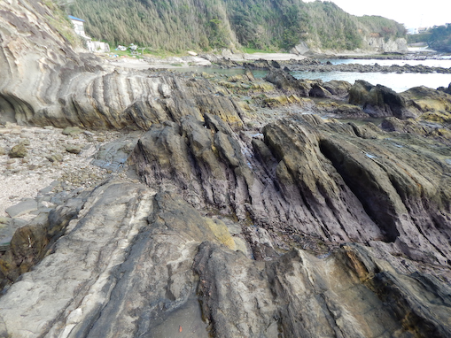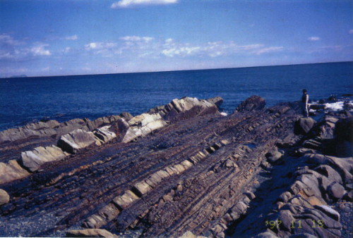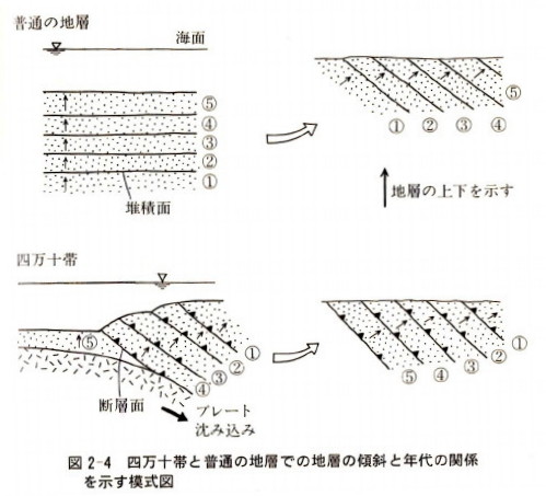 | 2465 Date: 2017-05-01 (Mon) 四万十帯の傾斜と年代の関係 平朝彦氏の「日本列島の誕生」p.56にある図2−4を見ていて、なるほど付加体は普通の地層と違うのか、と納得しそうになりました。 ![]() 「日本列島の誕生」にある四万十帯と普通の地層での傾斜と年代の関係(模式図)図2-4 四万十帯は[2452]に示した日南海岸の写真を見ても分かるように陸側(北側)が上がる構造です。ですから、図2-4の右上の図は次のように表示されるべきです。 ![]() 付加体のモデル実験では海側(南側)上がりの傾斜構造になってしまいますが、四万十帯の現実とは違うのではないでしょうか。「付加体」という概念に問題がありそうです。 高知県沿岸の四万十層も陸側上がりの傾斜です。 ![]() 高知県沿岸の四万十層、陸側上がりです。井戸掘りのすすめより isshy7@kfz.biglobe.ne.jp 追記: 興味深いのは日本海側の海岸のタービダイトが南側(陸側)上がりになっていることです。これを付加体とするのには無理があります。 ![]() 島根県、小伊津・長尾鼻の砂泥互層(出雲市)南上がりの傾斜