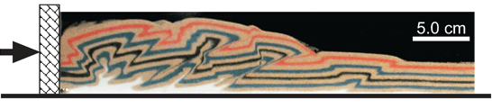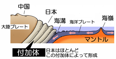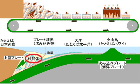 注: What Does an Accretionary Wedge Look Like? Going back to our analogy of shoveling snow, if you look down at the snow you are scraping off the concrete, it will look like an un-orderly jumbled mess of snow sitting on top of your shovel. Accretionary wedges look much the same way. They have jumbled deposits of original rock layers and metamorphic rock. Now, unlike our snow shovel example, the forces associated with subduction zones are quite large. So as the rock is being scraped off of the down-going plate and deposited on the overriding plate, they are subjected to a huge amount of pressure that will actually cause the original igneous and sedimentary rocks to become metamorphic rocks. ![]() ![]() 潜り込みに伴う力は巨大です・・・空想に過ぎない。自重で沈んでいくプレートに、そのような力は作用するはずがない。