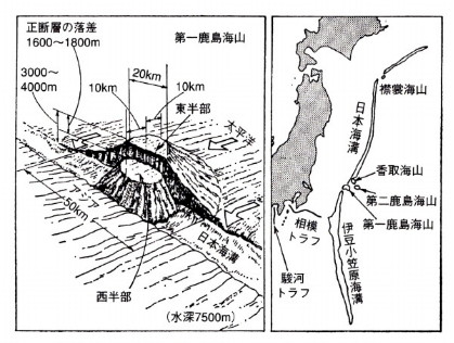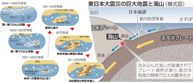 太平洋側と日本海側がともに陸側上がりの傾斜になっているということは、日本列島が誕生したのは本州の中央軸北寄り(大仙付近か)で火山活動などで盛り上がったのではないかと・・・・想像します。 ![]() 想像してみました。空想かも・・・ですが、本当はもっと複雑でしょう。でも・・・