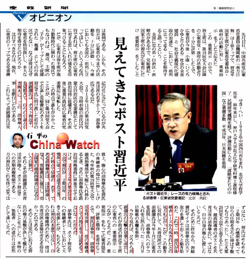 | 2470 Date: 2017-05-04 (Thu) 憲法改正の動きと「ポスト習近平」問題そして地震兵器 三つの話題がどう関連するというのでしょう? 私は地震兵器に関して多くの情報を持っておりませんので、確信をもってコメントすることができませんが、「地震の発生メカニズム」から考えて、地震兵器の存在はありえるだろうと思っています。 3年前に書いた、[1961] 活断層理論はルーズベルトの仕掛けた地震兵器隠蔽工作か?では、 『「断層理論」とは第二次大戦のなかで、地震兵器開発の隠蔽工作として、ヤハウェー・ルーズベルトが「地震の原因」を晦ますため仕組んだものではないのか』 と推理しました。 日本はルーズベルトには苦しめられましたが、同じヤハウェーの魂を持つ隣国の次期指導者の動向には注意を怠ってはならないことも述べました。 隣国では、その人物が次期指導者に選ばれる道ができつつあるようです。習近平氏の本意ではないようですが、流れは止められないのではないでしょうか。石平氏のChina Watch「見えてきたポスト習近平」を紹介します。