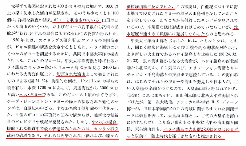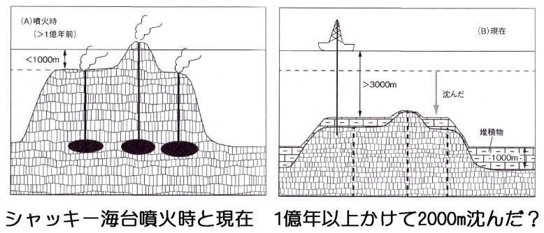 | 2597 Date: 2017-10-14 (Sat) シャッキー海台の説明など佐野氏解説の矛盾 三部作動画「その3」の後半で「シャッキー海台」が海面上にあった話を紹介しました。 ![]() この話は、[2550]で紹介した佐野貴司氏の「海に沈んだ大陸の謎」にもある記述ですが、矛盾点が多いので再度解説します。 [2550]で、シャッキー海台の部分に関しては、以下のようにコメントしました。 ーーーーーーーーーーーーーーーーーーーーーーーーーーーーーーーーーーー 「p.184には「ギョーはサンゴ礁がつくった環礁が海底に沈んだものと考えられ、したがってかつては暖かい浅い海だったはずです。(このように全ての巨大海台は長い年月をかけて現在の深さまで沈降しました。)」とあります。 ーーーーーーーーーーーーーーーーーーーーーーーーーーーーーーーーーーーーーーーーーー ギョーが火山であることは認定されている筈なのに、著者はサンゴ礁が沈んだもの、と理解しています。しかしシャッキー海台の解説図では、形成時に噴火があったような図解になっています。そして1億年以上かけて2000m以上沈下したと説明しています。
