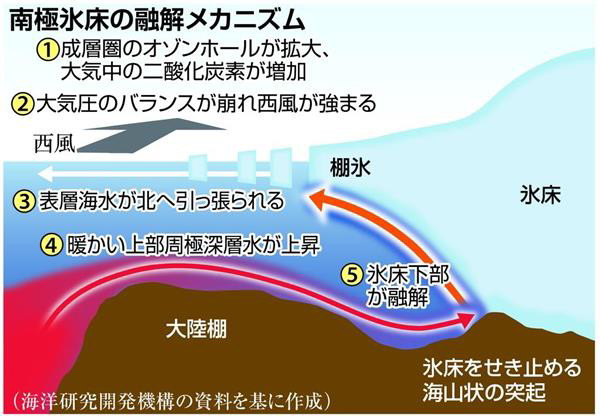 南極の氷床が大規模に崩壊したらどうなるか。国連の気候変動に関する政府間パネル(IPCC)による温暖化が最も進む予測シナリオは、氷床崩壊を想定していないが、2081〜2100年における世界平均海面水位が1986〜2005年の基準から45〜82センチ上昇する。これに南極氷床の大崩壊が加われば、海面水位がさらに上昇し、世界各国の沿岸部の大都市が水没する恐れも出てくる。 また、海洋が持つ「物理ポンプ」という機能への悪影響も懸念される。表層の海水は大気中の二酸化炭素を限界まで吸収して重くなり沈降、まだ二酸化炭素を吸収できる新たな海水が浮上して入れ替わり、ポンプのように二酸化炭素を深層へ運搬する仕組みだ。 氷床が溶けて淡水が流れ込めば、塩分濃度が下がって表層海水の比重が軽くなり、物理ポンプの働きが弱まってしまう。その結果、温暖化を加速することにもなりかねない。 西風が強まっている理由については、まだ解明されていない。だが、成層圏のオゾンホール拡大に伴う二酸化炭素など温室効果ガスの増加で、大気に蓄積される太陽熱の分布が変わり、大気の圧力差が拡大してバランスが崩れたためだとの分析が最近発表された。成層圏の変化が風を介して海の深層に影響を与えた格好だ。 これらの分析の多くはコンピューターのシミュレーションに依存しているが、実は氷床や海氷の融解を再現するには、気象条件や海流の変化など、多様な要素を考慮する必要があり、高精度な結果を出すのは非常に困難なのだという。 そのため海洋機構は「現地での詳細なデータ収集を今後も継続していく必要がある」としている。 ーーーーーーーーーーーーーーーーーーーーーーーーーーーーーーーーーーーーーーーーーーーーーー 日本の研究者たち(JAXA、JAMSTEC)は「オゾンホール拡大に伴う二酸化炭素など温室効果ガスの増加」が原因で西風が強まり、暖かい海水が上昇したと考えていますが、原因と結果が逆なのではないでしょうか。 火山活動によって氷床の温度が変化し、それが原因で西風が起きるのではないでしょうか。 「氷床の下部から地球内部の熱が上昇している」ことによって、氷床の温度が高まる、というまったく逆の現象が起きているのです。 地震の原因に関しては、原因(爆発)と結果(断層)が逆転していますが、南極の温暖化に関しても、因果関係が逆転しています。どれほどシミュレーションプログラムを開発しても、 |