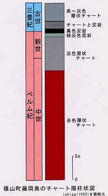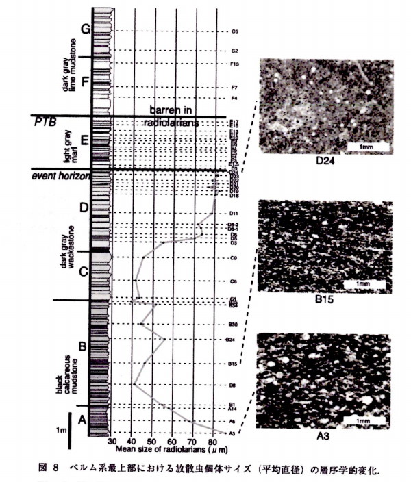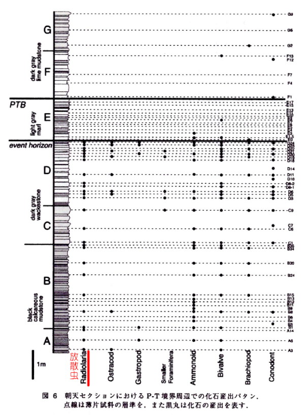 | 2599 Date: 2017-10-23 (Mon) 放散虫を産しないチャートの形成理由 「福井市の自然史博物館」のサイトに「南条山地には放散虫を産しないチャートがある」という記事が載っていることを[2508]で紹介しました。どのような分布になっているのか興味があったので同博物館に問い合わせたのですが、担当していた学芸員が退館されたそうで、詳しい話が聞けず、残念でした。 放散虫を産しない層があることは[2517]にも紹介しましたが、ネットで調べると中国四川省の朝天地区という場所で調査した結果が地学雑誌に載っていました。 「中国四川省北部朝天におけるペルム紀−トリアス紀境界の詳細層序」という論文から抜粋して紹介します。 ーーーーーーーーーーーーーーーーーーーーーーーーーーーーーーーーーーーーーーーーーーーーーーーー 産出化石と年代 朝天セクションのP-T境界周辺から産する各種化石の産出状況を図―6に示す。