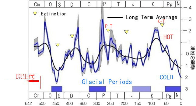| 2604 Date: 2017-11-02 (Thu) 生物大量絶滅の原因は地殻移動にある 顕生代に入って、生物の大量絶滅が5回、小さなものを含めると計10回の生物絶滅現象が起きています。その原因は巨大隕石の衝突説や火山噴火説などがあって、明確には分かっていないようです。 しかし、地殻の移動によって、生物が生存できない極域に押しやられて、絶滅した可能性も充分に可能性があります。 次の図はウキペディアに載っているもので、生物の絶滅が起きた10回の年代を示しています。黄色の三角がビッグファイブと呼ばれる5大絶滅事件を意味します。 ![]() 顕生代における生物多様性(科レベル)の推移。 横軸は年代を表し単位は百万年。灰色がセプコスキのデータ、緑色が"well-defined"データ、 黄色の三角が5大絶滅事件(ビッグファイブ)。 2億5100万年前に位置する谷間がP-T境界、右側6550万年前の谷が恐竜が絶滅したK-T境界 また、6千数百万年前のK-T(またはK-Pg)境界では恐竜が絶滅しました。絶滅の原因はユカタン半島に巨大な隕石が落下したことがあげられていますが、隕石が落下した後も、恐竜は生きていたという話もあり、明確ではありません。 次に示すのは[1559]で紹介した氷河期の説明図を上に示した生物絶滅図と対比させるために左右を反転して描いたものです。 ![]() 氷河期と生物絶滅期の関係 これまでにも解説してきたように、地球全部が凍結するようなスノーボールアースではなく、温暖で繁栄していた地域が寒冷な地域に急激に移動してしまった経験(原因も理解できないまま)が語り伝えられているように思います。 図を見ると、氷河期と生物絶滅期には明確な一致は見られません。しかし、生物が激減した時期は寒冷化が起きた時期と重なっています。寒冷化が起きても絶滅していないのは、大陸の配置と関係しているように思います。 恐竜の化石が多く発見されるアメリカ大陸や浅海域などが極域に移動すれば、絶滅の規模も大きくなりますが、現在の北極のような深海の海洋部分が極域に移動しても生物が絶滅することはないでしょう。南極大陸のような広大な地域が極地入りした場合には絶滅種も増えるのではないでしょうか。 つまり、氷河期とか生物の絶滅という現象は、その当時の大陸の配置と地殻移動の状況によって変わるのだと推定できます。 [2568]、[2570]などでも紹介しましたが、極地は西太平洋に存在した時期もあれば、アラスカ湾、北西大西洋に存在した時期などもあった可能性があります。 地球は何度も姿勢を変えていることを認識しないと、地球上の謎は解けません。また、大陸と海洋が何度も入れ替わっている事も、重要な認識です。「大陸地殻が海洋地殻に変わることはありません」とか、「太平洋にはムーが、大西洋にはアトランティス大陸が、インド洋にはレムリア大陸があったことなどオカルトです」と言うような否定をしていては、真の地球科学が誕生することはありません。 |