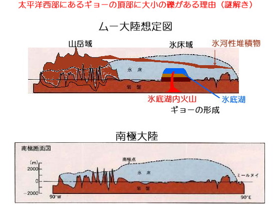 | 2595 Date: 2017-10-07 (Sat) 太平洋西部のギョーに巨礫が存在する理由 アーサー・ホームズ著「一般地質学L」に、西太平洋に存在する全てのギョーの頂部から「円磨された巨礫および小礫が見られる」という記事があります。 ![]() ![]() アーサー・ホームズ著「一般地質学L」p.564より しばらく、不思議に思っていましたが、太古の昔に南方古陸が存在していたとすれば、納得できるメカニズムを思いつきました。 当然ですが、ムー文明が誕生するはるか以前の超古代に存在した南方古陸なのだと思いますが、ギョーの上に礫が存在するメカニズムを南極大陸の氷床を想定しながら、推定してみました。 ギョーそのものは[1817]に図解したように、氷床の発達した極域の氷底湖内部での火山活動で形成されるものだと推定しています。(定説では波蝕によって形成されたことになっています) その上に礫が存在するのは、南方古陸が今の南極大陸のような極域にあって、氷床も発達し、山岳域から崩壊した岩石が“迷子石”のようになったもの、だと推定しました。つまり、氷河性堆積物ではないかということです。 山岳域の河川を流下して円磨された時代もあり、また氷河が形成された時代もあって、運搬され、氷河に押し出されたのではないでしょうか。その後、地殻のスライド現象で、古陸が極域を離れ、氷床が消滅すれば、礫はギョーの頂部に取り残されることになります。 古陸には長大な河川が何本もあり、北方にはオーソコーツアイトを運び、東方には巨礫を運んだ、と考えることはできないでしょうか。単なる御伽噺ではない、妥当性のある話だと思います。 勿論、古陸は海の底に没していますので、実証することは不可能です。 ![]() 太平洋西部のギョーに礫が存在する理由 なお、ホームズの解説では「沈水速度が速すぎて環礁には発展しなかった」となっていますが、環礁になるのは、ギョーが浅い場合であって、「沈水速度が速すぎて環礁にならなかった」ということはありません。 天皇海山群もギョーですが「陸上時代を経てきた」という解釈は必ずしも成り立ちません。「氷床時代」というのなら理解できますが、「陸上時代」があったのなら、南アフリカのテーブルマウンテンやギニア高原のテプイのような存在になる筈です。 参考:Wikiより ギヨーの形成 海洋底との比高が1,000m以上の孤立した円錐形の山は海山(seamount)と呼ばれ、特に頂部が水深200m以深にあって平坦なものをギヨーと呼んでいる。数多くの調査と採泥の結果から、ギヨーを含む海山のほとんどが火山であることが分かってきており、ギヨーの平頂面から玄武岩の円礫や浅海性の化石などが採取されたことから、波蝕によって平坦化されたことが判明した。 ハリー・ハモンド・ヘスが1946年に北大西洋で160にのぼる頂上が平坦な海山を発見し、スイスの地質学者アーノルド・ヘンリー・ギヨー(英語版)(1807年 - 1884年)にちなみ、ギヨーと名付けた。 |