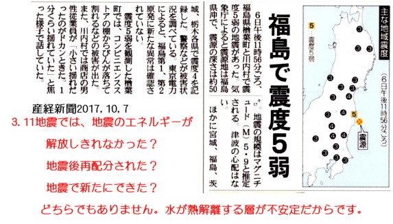 | 2594 Date: 2017-10-07 (Sat) PT論や付加体論を真理であるかのように扱うのは間違っている 昨日福島県沖で震度5弱の地震が起きました。気象庁も、メディアもこの地震の原因を何も報じていません。