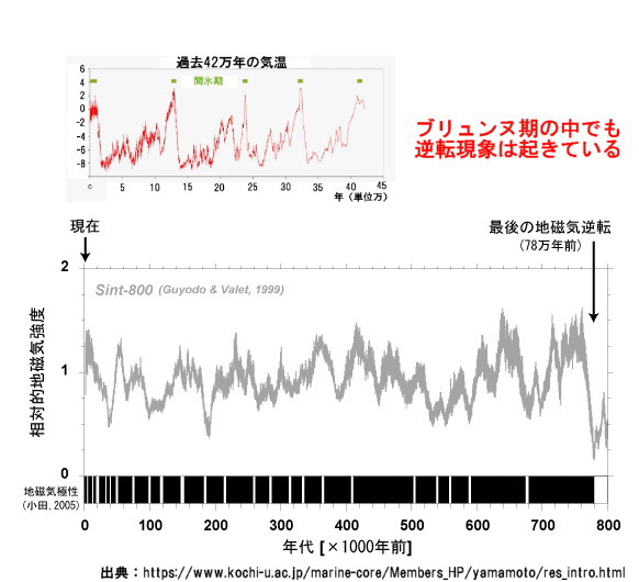 [1224]に解説したようにブルネ(ブリュンネ)期の中でも2万年、3万年付近に地磁気は逆転しています。アトランティスが沈んだと言われるのが1万2千年前ですが、その前後に地中海の地形や気候に変動があったことはカイロ郊外のクジラの化石やマングローブの化石が証明しています。([2462]斉一説から激変説へとパラダイムシフトしよう参照) こうした気候の変化が起きたということは、地磁気だけの逆転ではなく、地軸そのものが傾斜を変えた(地殻が移動した)と考えた方が合理的だと思います。 地球の歴史に関してはまだまだ謎がたくさんありますが、それを解く鍵がアインシュタインが支持したハプグッド教授の「地殻移動論」だと思います。石田理論では「第2地動説」([2439]参照)と呼んでいる現象です。 |