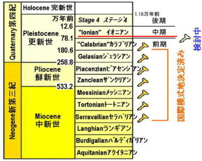| 2614 Date: 2017-11-14 (Tue) チバニアン・残留地磁気逆転の地層国際的に認定 地球の磁場が逆転した証拠となる地層が千葉県にありますが、千葉の名前を取ってチバニアン(チバ時代)という呼称が国際的に認定される動きにあるようです。 ーーーーーーーーーーーーーーーーーーーーーーーーーーーーーーーー ![]() 養老川(手前)沿いにあるチバニアンの申請の根拠となった地層「千葉セクション」。 N極とS極が逆転したとみられる痕跡が残る=千葉県市原市で、海老名富夫撮影 チバニアンについては、茨城大と国立極地研究所などが6月、同県市原市の養老川沿いにある地層「千葉セクション」の分析結果を基に、中期更新世を代表する地層として命名を申請。イタリアもイオニア海の近くにある2地層「イオニアン」を申請していたが、日本の申請が同連合での1次審査を通過したことを極地研などが13日発表した。 票が小差なら決選投票になる可能性があったが、部会メンバーのうち6割以上が日本を支持したため、1回で決着したという。 同連合は残る2回の上位部会と総会を経て、来年にもその時代を代表する「国際標準模式地」に正式認定する方針。内定が覆る余地はあるものの「千葉」の名前が地質年代に刻まれる可能性が高い。 地層の千葉セクションでは、77万年前に磁場が逆転したことを示す痕跡が鉱物などに良好な状態で残っているという。地球の磁場を示すN極とS極は過去360万年の間に計11回、逆転したと考えられ、この地層はその最後の逆転を示す証拠とされる。磁場の逆転は、地球中心の核が影響しているとみられるが、原因は解明されていない。中期更新世は最後の逆転を「境界」にすることが決まっており、同連合が日本、イタリアの申請を審査していた。 過去には作業部会の内定が最終段階で覆ったケースもあるため、研究グループの岡田誠・茨城大教授は「ひとまずほっとしているが、まだ審査は続くのでしっかり対策を立てたい」と話している。【酒造唯】 【ことば】地質年代 46億年の地球の歴史を、当時の生態系や気候変動などを基に115に区分したもの。大きな区分では、恐竜が繁栄した「ジュラ紀」や「白亜紀」などが有名。国際地質科学連合は、各時代の境界となる最も代表的な地層を「国際標準模式地」として世界で1カ所だけ選ぶ。選ばれれば、その地名にちなんだ地質年代をその国で命名でき、「黄金のくい」を表す「ゴールデンスパイク」が現地に打たれる。 ーーーーーーーーーーーーーーーーーーーーーーーーーーーーーーーーーーーーーーーーーーーーー 地磁気が現在と逆転していた時代があることを最初に発見したのは京大の松山基範先生です。玄武洞の調査で見出したのですが、当時は恩師からも常識ハズレと叱責され、小馬鹿にされたそうで、後世になってようやく地質年代に「松山期」として名前が残りました。([1826]松山基範先生の実の功績参照) チバニアンという呼称はイタリアが主張する次図にあるイオニアンに取って代わるもので、77万年まえから12万6千年前までの更新世中期を指す呼称です。