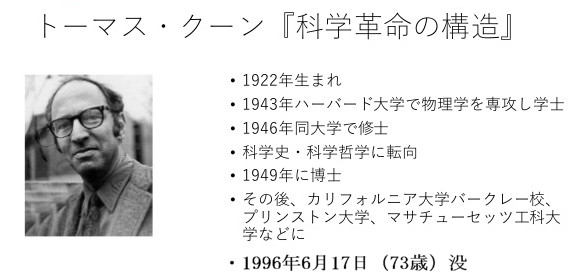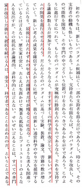 | 2619 Date: 2017-11-24 (Fri) トーマス・クーンの「科学革命の構造」より トーマス・クーンの「科学革命の構造」の中に、面白い一文をみつけました。 ![]() ![]() トーマス・クーン「科学革命の構造」(中山茂訳 みすず書房)より 「一つのパラダイムが勝利をかち得るには、始めに若干の支持者をかち得て、その人たちが頭の固い連中の論議を呼び起す所にまで、そのパラダイムを発展させるようにならねばならない。このような論議が起こっても、それだけでは決定的ではない。科学者は、訳の分かった人間であるから、最後には理解する人も多いだろう。しかし、単一の論証だけで彼ら全部を改宗させることはできない。一つのグループの改宗をかち得るだけでなく、専門家の大部分の信用を徐々にかち得るようにならなければならない。」 という一節に続く文章です。 いまは学会もマスコミも頑固者のプレート論信仰者ばかりの世界ですが、何年か後に地震理論の科学革命が終了する頃には、「事実上科学者であることを止めた人」が残っていることになるのでしょう。 その前に、ギリシャの民衆がソクラテスを「青年をたぶらかした罪」で死罪にしたような愚行が無いように願いたいものです。 |
