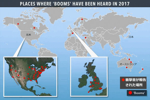 | 2620 Date: 2017-11-25 (Sat) 世界中で起きている爆発音の謎を解く 世界各地で謎の爆発音が感知されているようです。これは、すでに[1619](東海地方、関東地方、琵琶湖付近)、[2059](佐渡地域)、[2212](中国杭州市)などで紹介してきましたが、アメリカではセネカガンと呼ばれているもので、認知はされていませんが水が解離した水素ガスの爆発現象だと考えています。 まず、In Deep の記事から抜粋して紹介します。 ーーーーーーーーーーーーーーーーーーーーーーーーーーーーーーーーーーーーーーーーーーーーーーーーー 地球のどこで何が起きているのか? : 全世界の60カ所以上から「発生源不明の大きな衝撃音と地鳴りのような振動」が断続的に報告され続けている ![]() news.com.au 「何かが起きている」のは確定的だけれど、一体何が……? この数年は、「不可解な音が聞こえる」というような報告とか、フェイクを含めてのニュースなどはよくありましたけれど、今、世界中で起きている音の「事件」は、以前とは比較にならないほど「何か起きている感」が強いものです。 何しろ 10月くらいから、公式に報告されているだけでも下の地図にある 64の場所から「大きな衝撃音と振動」が報告されているのです。