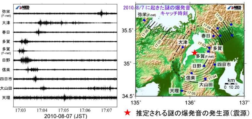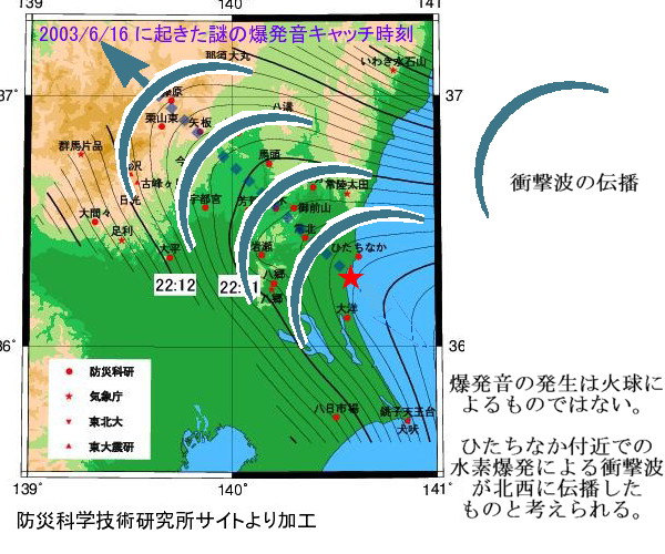 どのような状況なのかを、まず最初に、ここまでの流れをまとめている冒頭のオーストラリアの報道をご紹介します。 世界各地の 64 の異なる場所で鳴り響く発生源不明のミステリアスな衝撃音。NASAにも理由はわからない 現在、オーストラリアを含む世界の 64 の異なる場所で謎の衝撃音が記録され続けている。しかし、NASA はその音が何なのか説明できないようだ。 ミステリアスな音が世界各地で鳴り響き、さまざまな場所で人々が困惑している。 その恐ろしい音は、中東から今年のヨーロッパ、そしてオーストラリア、アメリカの東海岸にまでいたるところで記録されている。 今週は新しい報告として、アメリカのアラバマ州で住民たちを脅かす衝撃音が記録されている。地元の警察は 11月20日の午後 9時頃に、発生源の特定できない「非常に大きな衝撃音」が聞こえたと伝えている。 この衝撃音は、多くの家を揺さぶるほどのものだった。 しかし、警官や専門家たちは、この不可解な衝撃音を引き起こした発生源を把握していないようだ。 一部の専門家たちは、原因が超音速の航空機による大気中での空気の振動(ソニックブーム)ではないかと述べている。 10月10日には、同様の音がオーストラリア・ケアンズで鳴り響き、地元民たちを混乱させた。多くの人々は戦闘機 F/A-18A-D ホーネット が飛んでいるのだと思ったという。 その 2週間後には、南オーストラリアのエアー半島で、また同じ衝撃音が鳴り響いたが、その際、音が鳴るのと同時に、空を「青い流星」が横切っていった。 その青い流星は、目撃者が報道メディアに語ったところによれば、「それは、どんどん大きくなり空を横切る中で大きく光りました。そして火花のようなものを放っていました」というようなものだった。 その後、大きな音が2度聞こえたと同時に空が輝き、大地が2度大きく揺れたように感じたという。 これらを含め、現在までに世界の 64 の場所から同じような報告が続いている。 アラバマ州では、「家全体を揺り動かす」ほどの信じられない大きな振動と衝撃があったと報告されている。 アメリカ国立気象局のアラバマ支局は、この音は航空機のソニックブーム、あるいは、流星群からの流星によるものである可能性があると語った。 その音の際には、アラバマ州の住民たちから「大きな衝撃音」に関しての多くの SNS への投稿があった。しかし、衛星や事故や火災などはなく、また、アメリカ地質調査所(USGS)によれば、その時には地震も起きていない。 NASA のビル・クーク(Bill Cooke)氏は、アメリカ ABC ニュースの取材に対して、このアラバマ州の不思議な衝撃音の発生源はいまだに不明だと語った。 クーク氏は、その音は、巨大な超音速航空機や地上での爆発によって生成された可能性があると考えている。 NASA の流星科学者たちはは、この衝撃音の発生した原因を突き止めるために、新しいデータを分析し続けているという。(以下省略) ーーーーーーーーーーーーーーーーーーーーーーーーーーーーーーーーーーーーーーーーーーーーーー 以上がIn Deepで紹介された記事の抜粋です。 NASAの科学者は発生源が何んであるのか不明であるとしつつも、[1619]で紹介した防災科学技術研究所(Hi-net観測網)の解析と同じ流星(火球)による大気圏突入時の爆発音だと解釈しているようです。 しかし、Hi-net観測網にある[図−3火球から発生した音波が伝播する様子]の解釈は[1619]でも述べたように「火球による衝撃波が何回も連続して起きた」ことになり、納得できません。 石田理論としては、[502]すこぶる付貴重な情報にある「ウミウ捕獲場所の崩壊」からも推定されることですが、大洋村付近での爆発(ごく浅い場所での解離ガス爆発)が衝撃波を発生させたのだろうと考えています。 Hi-net観測網の[図−2防災科研Hi-netで記録された火球による振動波形例]を見ると「ひたちなか」から矢板まで(約70km)を67秒で衝撃波は移動しています。ウミウ生け捕り場所付近で発生した水素爆発による衝撃波が平均速度マッハ3.06で矢板まで伝播し、消滅したと考えるのが一番妥当な解釈だと思います。 衝撃波が北西に伝播したのは爆発時の「押し円錐軸」が北西に向いていたからだと思います。