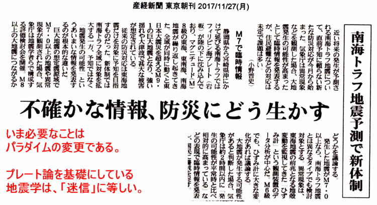 | 2626 Date: 2017-12-14 (Thu) 熱移送理論による来年1月の地震説は支持できない 現代ビジネスに「来年1月、伊豆で大きな地震があるかもしれない」ある研究者の警告という記事があります。抜粋して紹介します。 ーーーーーーーーーーーーーーーーーーーーーーーーーーーーーーーーーーーーーーーーー 12/13(水) 11:00配信 どうか耳を傾けてほしい こう警鐘を鳴らす学者がいる。あと一月ほど未来の非常に忌まわしい予測で、ややもすればオカルトのように捉える人もいるかもしれない。しかし筆者はこの警鐘を、比較的可能性の高い情報としてとらえている。 彼の声はあまりに小さく、この情報を知っている人はごく少数だ。その理由は、彼が地震学の権威である東京大学地震研究所に籍を置かない「地質学」を専門とする学者だからだ。 地震学の門外漢であるこの学者の警鐘をなぜ筆者が信用しているかといえば、彼が長年培った地質学的見地に基づいて導き出した「地震発生メカニズム」を提唱しているからだ。 注目すべきは熱エネルギー 「熱移送説」の特徴は、地震を発生させるエネルギーを「熱」と考えていることだ。 「プレート説」をとる地震学者は、地震を発生させるエネルギーはプレートが移動してくる際の大きな圧力と考えているが、角田氏は地球の地核から発生してくる「熱」をエネルギーとする。熱エネルギーは火山の噴火を発生させるが、地震にも大きな影響を及ぼしているというわけだ。火山の多い日本で地震が発生するのも、そのエネルギーが「熱」だからだと考えれば分かりやすい。 火山の場合は、熱エネルギーが伝わると熱のたまり場が高温化し、そこにある岩石が溶けてマグマ(約1000度に溶けた地下の岩石)が発生する。この際に高まったガス圧によって噴火に至る。 一方、地震は地下の岩層が熱で膨張して割れることによって発生する。例えば鉄を溶接したものは大きな力をかけても剥がれにくいが、熱することで簡単にはがれるようになる。これと同じで、熱のエネルギー量が多ければ多いほど、大きな破壊=地震が発生するのである。 ではその熱はどこから来るのか。 大元のエネルギーとなる「熱」は、まず地球の中核から地球の表層に運ばれる。86年に米国地質調査所(USGS)でMRI(核磁気共鳴装置)の原理を応用した技術、マントルトモグラフィーを用いて地球内部の温度分布図が作成され、角田氏がこれを分析したところ、地下3000キロメートルから地球の表面に向って約6000度の熱エネルギーが上昇していることが分かった。 この熱エネルギーの表層での出口は、南太平洋(ニュージーランドからソロモン諸島にかけての海域)と東アフリカの2か所が確認されており、このうち南太平洋から表層に出た熱が日本の地震に大きく関わってくるという。