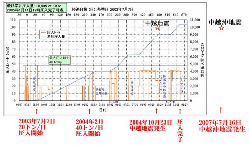 ![]() 日本CCS調査の苫小牧CCS実証試験センター。 正面の3つの塔でCO2を分離・回収している。奧に見えるのは出光興産の製油所(記者撮影) 北海道の玄関口、新千歳空港からほど近い苫小牧市。製油所や自動車部品工場が並ぶ湾岸の工業エリアに「苫小牧CCS実証試験センター」がある。 CCSとは、二酸化炭素(CO2)を回収し、地中深くに圧入・貯留する技術だ。大気に放出されるCO2量を削減できるため、地球温暖化対策の切り札の1つとされる。 IEA(国際エネルギー機関)によれば、2100年までに世界の気温上昇を2度以内に抑えるために、2060年までに必要とされる累積CO2削減量の14%をCCSが担うことが期待されている。日本でも2014年のエネルギー基本計画で、2020年頃のCCS技術の実用化を目指す方針が示されている。 回収したCO2は最大22.8メガパスカル(228気圧)まで圧縮されたうえで地中深く送り込まれる(圧入)。圧入地点(圧入井)にある大きな蛇口のような坑口装置には、さまざまな安全機能が付与されている。たとえば、津波などで坑口装置が破壊された場合、地中50メートルにあるCO2の逆流を防ぐ弁が自動で閉じるといった具合だ。 海外では稼働しているプラントも CO2の分離・回収プラントは化学工場などで使われる技術。掘削は油田などの資源開発の応用技術である。技術的には十分に実現可能なのだ。そもそもCCSは海外で1970年代から多数実施されている。もっとも海外のCCSの大半はCO2削減のためではなく、原油増産が目的である。 油田は操業が進むと地下の圧力が低下することなどから、原油埋蔵量があっても生産量は減退してしまう。そこで液体やガスを送り込み、原油増産を図るEORという技術がある。海外のCCSの大半は、CO2を使ったEORである。 ここにCCSの最大の難しさがある。CO2の回収にも地下への圧入にもコストがかかる。EORならば原油増産のメリットでこのコストを回収できる可能性がある。しかし、EOR以外のCCSでは利益を生まない。 CO2排出に対する課税、もしくはCO2排出削減に対する補助金がない限り、事業者に導入するインセンティブが働かないのだ。油田がほぼない日本でCCSを実用化できるか。これを検証するのがセンターの役割だ。 再エネが頼りにならず、原子力発電も受け入れないとなればCCSは必要になる可能性がある。相対的にCO2排出が少ない天然ガス火力でも、排出はゼロではないからだ。また、製鉄所や石油化学プラントなどからもCO2は放出される。こうした産業からの排出は、発電と異なりCO2フリーの代替手段がない。 ーーーーーーーーーーーーーーーーーーーーーーーーーーーーーーーーーーーーーーーーーーーーーーーーー バックナンバー資料によると、CO2の圧入は次図左のように、本年2月末で萌別層に14万トン圧入されています。注入との関連は不明ですが、苫小牧周辺においては圧入作業中である2018年1月31日にM4.7の地震が発生しています。