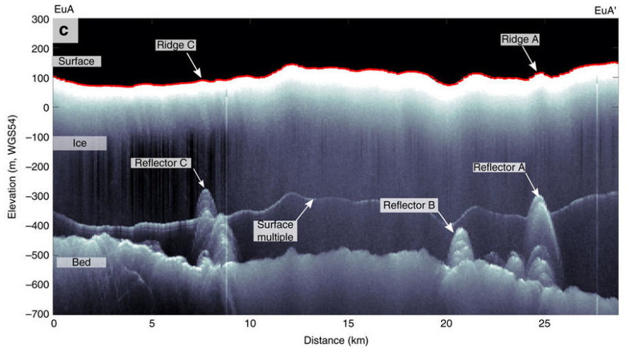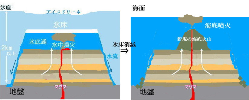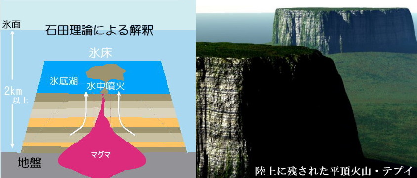 ーーーーーーーーーーーーーーーーーーーーーーーーーーーーーーーーーーーーーーーーーーーーーーーーーーーー 著者ら(ベルギーとドイツの研究者)の解説では「氷床下の水路が海水の混入で断面が広がり、流速が緩くなって堆積物が蓄積される」となっていますが、陸上の河川の力学のような現象は起きないと思います。エスカーという堆積物が300mもの山になるものかどうか、よくわかりません。 石田理論で考えられるのは、次図のように氷床に活火山があり、その上に氷底湖が形成されて、その内部で平頂火山、つまりギョーやテプイのような形状の火山が形成されているという推定です。Wikiの説明では海底からの高さが1000mを超えた海山のなかで平頂なものをギョーと呼ぶそうですから、現在進行形で形成されつつあるギョーまたはテプイということになります。 ![]() マリアナ海溝に存在するギョー 南極氷床下のレーダー画像 西太平洋に多いのは、そこが極地であった期間が長かったということだと思います。白亜紀には正磁気の期間が3千800万年という長期間継続したようです([2438]参照)から、西太平洋のギョーはその期間に形成されたものかもしれません。最大のギョー光孝、2番目の推古、3番目のPalladaが西太平洋にあるのも、白亜紀に形成された可能性が高いと思われます。 レーダー画像を説明できるエスカーとギョー以外の可能性は、南極に存在したミュートラム文明が作った超古代のピラミッドでしょうか。とすればこの近辺に人類の住居跡、あるいはギョレメのような地下都市があるかもしれません。飛躍過ぎる発想でしょうか・・・。 どちらにしても、地殻移動により、氷床の下に埋まったわけですから、地殻移動を合理的に説明しなければなりません。その理屈は[1783]ミュートラム大陸が極地入りした原因を参考にしてください。 参考:ミュートラムの最後 『太陽の法』には地軸の変化によるミュートラムの最後が載っています。今から十五万三千年前の出来事です。海底からの高さ(比高)が1000mを超えるというギョーが出来るのにはもっと時間が必要なんでしょう。 ミュートラム文明の最期は、地軸の変化が原因となっています。いまから十五万三千年前のある夕暮れ、人々は、空が異常に赤いことに気づきます。まるで血のような赤さです。識者のもとへは、たくさんの人からの問いあわせが殺到しましたが、だれひとりとして、その現象に答えることはできませんでした。 ------------------------------------------------------------------------------------------------- |