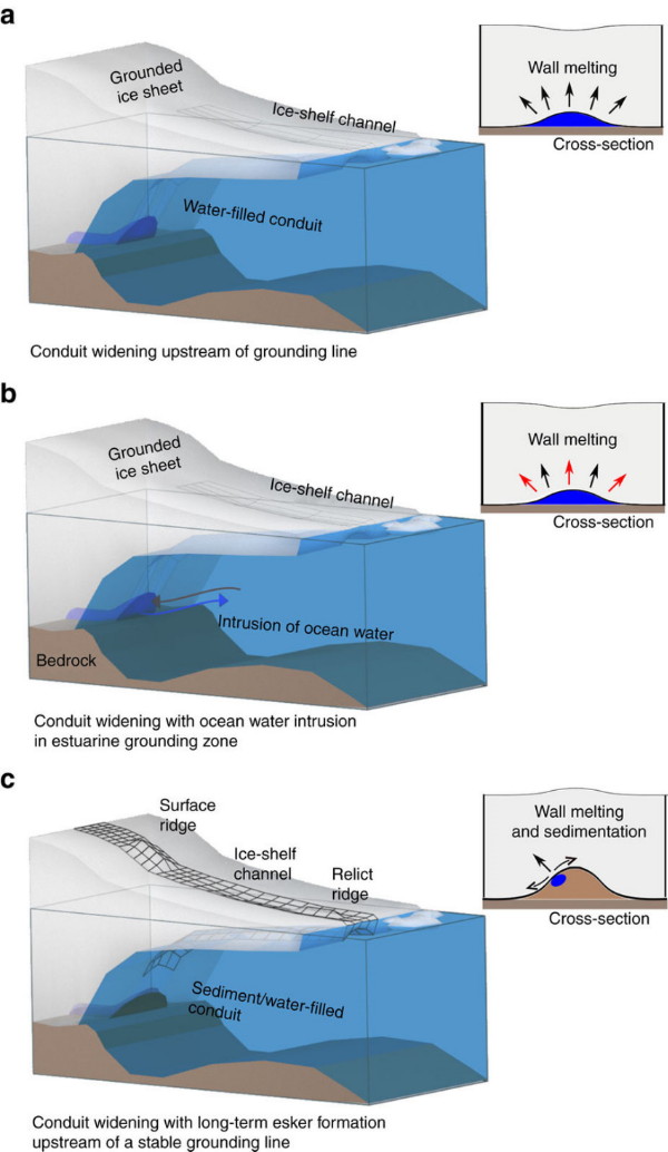 | 2717 Date: 2018-04-04 (Wed) 南極の氷床下でギョーが形成されつつあるのではないか 南極の氷床の下にエッフェル塔クラスの高さを持つ堆積物があるそうです。発見者は氷床下を流れる堆積物によって形成される地形「エスカー」だと推測していますが、300mにも達する堆積物の山が氷床下の流れで形成されるとは思えません。 エスカーとは氷河・雪氷圏辞典によると以下のような説明があります。 −−−−−−−−−−−−−−−−−−−−−−−−−−−−−−−−−−−−−−−−− ![]() ローレンタイド氷床の下で形成された巨大エスカー(カナダ・カルガリー近郊) −−−−−−−−−−−−−−−−−−−−−−−−−−−−−−−−−−−−−−−−− Wikipediaには以下のような説明があり、氷河が衰退するときにできるもので、高さは5m〜50m程度としています。南極には本当に300mものエスカーがあるのでしょうか、疑問です。 −−−−−−−−−−−−−−−−−−−−−−−−−−−−−−−−−−−−−−−−− エスカーは、氷河衰退(退氷)時に形成される地形である。氷河を形成している氷の中には、それが流れてくる過程で岩盤から削り出した砂礫(ティル)が多量に含まれている。このティルが氷河が後退する時に残される(堆積する)ことによってできる地形としては、他にモレーンや氷堆丘などが挙げられるが、このエスカーもそんな地形の1種である。したがって、モレーンや氷堆丘などと同様に、エスカーも主に砂礫(ティル)によって形成されている。エスカーのサイズは様々であり、周囲よりも5m〜50m程度高く、幅は10m〜200m程度、長さは500m〜50000m(50km)程度の範囲にあるものが一般的とされる。ただし、中には途中途切れる場所こそあれ、長さ500kmに及ぶ長大なエスカーも存在する。エスカーの形状は、ちょうど河川に作られる人工の堤防のように、側面は急峻な斜面であるのに対し、頂部は平坦になっている。エスカーの形成され方は、主に2通りあると考えられている。1つは、後退中の氷河の前方にできる氷河の氷が融解した水の流れに沿って形成される場合。もう1つは、同じく後退中の氷河の下の氷に囲まれたトンネル(氷河底)に、やはり氷河の氷が融解した水が流れる場所に形成される場合である。いずれにしても、これら氷河が溶けつつある時にできる水流によってエスカーは形成される。典型的なエスカーはヨーロッパ北部やカナダなど、かつて氷河が広範に存在していた場所にしばしば見られる。 −−−−−−−−−−−−−−−−−−−−−−−−−−−−−−−−−−−−−−−−− 石田理論では、南極の氷床の下で、平頂火山であるギョーが形成されている(進行中)のだと考えています。 将来、地殻の移動が起き、氷床が消えたときには、海面下なら、ギョーと呼ばれるでしょうし、陸上ならばテーブルマウンテンかテプイと呼ばれることになるでしょう。(ギョーの形成メカニズムについては、[1817]などを参照) トカナの記事を抜粋して紹介します。 ーーーーーーーーーーーーーーーーーーーーーーーーーーーーーーーーーーーーーーーーーーーーーーーーー 超古代文明の遺跡か、エイリアンの土木工事跡か!? 南極の氷床下に眠る“エッフェル塔級”の巨大構造物が確認される! 古代ギリシア時代から“未知の大陸”として、その存在が予言されていた南極大陸。この場所では近年、数多くの奇妙な物体が次々と発見されている。2012年には、ロシア国防省が南極氷底湖・ボストーク湖から“黄金の鉤十字”を発見したという衝撃的なニュースが世界を駆け巡った。氷底湖の調査を行うロシア調査団が、氷床下3,800m付近のボストーク湖内で、明らかに人工構造物と思しき、幅・高さ共に推定100m程の黄金に光る鉤十字を見つけたのだ。 また同年には、米国とヨーロッパの国際チームも、南極大陸上にそびえる3つのピラミッドを発見したと報告している。奇妙な物体の報告例が相次ぐ中、今月10日には超常現象を報じる海外ニュースサイト「EWAO」が、またも南極の氷床下に眠る巨大な構造物の存在を伝えた。これは果たして、地球外生命体による土木工事の痕跡、もしくは過去の人類によって生み出された超古代文明の遺跡なのだろうか!? 今回、専門家は航空レーダーのデータと反射器を使った調査により、棚氷に3つの水路口を発見した。それと同時に、南極大陸の氷床下に、他の観測地域と比べて5倍以上もの大きさを誇る水路と、隆起した堆積物が存在することも明らかになった。ブリュッセル自由大学(ベルギー)とバイエルン科学アカデミー(ドイツ)による研究では、問題の地下水路の幅が海へと近づくにつれ拡大していることや、それに伴い氷の融解速度も減じていることが判明している。 なお、融解速度が減速することで、水路口付近には数千年分もの堆積物が存在し、現在それらがエッフェル塔(321m)並みの大きさの隆起を形成しているという。一部の科学者は、この奇妙な構造物について、氷床