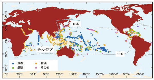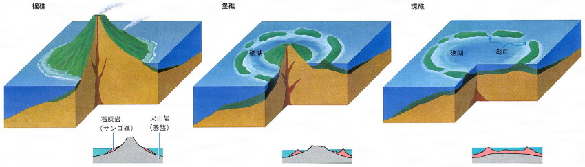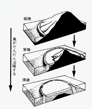 主に亜熱帯に分布している。環状の礁の部分と、環礁内部の礁湖で構成される。環状の礁の外形は、大きいもので数十キロメートル、環の幅は広いもので数百メートルあり島を形成することがある。環は円になるとは限らず様々な形状をしており、水面に現れる部分が環状に点在するケースが多い。礁湖の海水が満潮時と干潮時に外洋に出入りする自然にできた水道(礁門)があり、船舶が礁湖に出入りできることが多い。世界最大の環礁はマーシャル諸島のクェゼリン環礁。モルディブなどは環礁で形成されている国として知られている。 形成過程については、チャールズ・ダーウィンが唱えた沈降説によって説明できる。すなわち、まず熱帯の火山島の周囲に珊瑚礁が形成される。その後、火山島が沈降することにより、珊瑚礁のみが上方に成長、中央の火山島が完全に海面下になると、環状の珊瑚礁のみが海面に残る。現在では、沈降の原因はプレート運動で説明される。したがって、環礁は海洋プレート上の、ホットスポットから離れた周辺部で、しかも低緯度の地域に存在する。 環礁上に形成される島を、環礁州島又は州島と言う。珊瑚礁のみで形成されているため、州島の標高は低く、高いところでも数メートルである。礁湖の水深は50 〜 80mであるが、礁の外縁の海底は急崖となっており、海岸よりさほど遠くないところで、水深4,000〜 6,000mの大洋底になっていることも珍しくない。礁湖の深さについては氷河制約説がその説明に使われる。 なお、環礁が大きく隆起すれば、周囲を絶壁で囲まれ、中央にくぼみのある島になる。これを隆起環礁といい、南大東島・北大東島などがその例である。 ーーーーーーーーーーーーーーーーーーーーーーーーーーーーーーーーーーーーーーーーーーーーーーーー ダーウインの沈降説では火山島がプレートの移動によって深部に沈降し、珊瑚礁だけが成長を続けることになっています。矛盾点を挙げておきます。 ・東太平洋や大西洋に何故環礁が少ないのか説明できない。