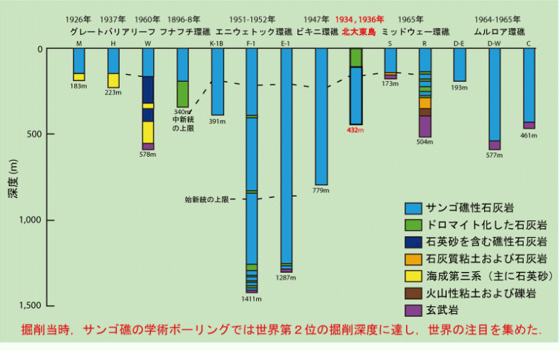 | 2722 Date: 2018-04-08 (Sun) 定説理論ではボーリングデータを正しく読み解くことが出来ない [2721]で、「ボーリングによるコア調査は重要ですが、基本的なメカニズムを見出さないと、調査結果を正しく解釈することができない」と述べました。 エニウェトク環礁のボーリングでも、1300mの石灰岩(造礁珊瑚)をどのように解釈するのか、沈降した証拠なのか、そうでないのかは、基本的メカニズム(理論)が違うと結果が違ってしまいます。 ーーーーーーーーーーーーーーーーーーーーーーーーーーーーーーーーーーーーーーーーーーーーーーーー 沖縄本島から約400km。海上8kmを隔てた隣同士に南大東島と北大東島は存在します。 ![]() 大東島は堡礁のようにも見えるが環礁と考えられている(参考2:) これぞ南大東島が世界に誇る地球からの贈り物。星野洞は東洋一美しい鍾乳洞として、世界中の洞窟研究者から注目されています。大東諸島(北大東島・南大東島・無人島の沖大東島)は、赤道近くのニューギニア沖で海底火山として生まれ、プレートに乗って6000万年かかって3000kmも北上してくる間に、サンゴが堆積して誕生しました。 周りは深さ4000mの太平洋で2000mの厚みの珊瑚性石灰岩でできている島なので、たくさんの鍾乳洞があります。その中で一番大きく美しく唯一観光洞として整備されているのが星野洞。地上差40m広さは約1000坪もあり、ほとんどが外気にふれることなく、まっ白い鍾乳石です。大規模で状態が良いので、世界的にも貴重とされています。 ーーーーーーーーーーーーーーーーーーーーーーーーーーーーーーーーーーーーーーーーーーーーーーーー 島の形成に関しても、付加体理論と同じ“通俗説”が出回っていて、「プレート論」で解釈されています。「赤道近くのニューギニア沖で海底火山として生まれ、プレートに乗って6000万年かかって3000kmも北上してくる間に、サンゴが堆積して誕生しました」というのは一つの仮説です。しかし、何度もいうように、プレートテクトニクスや付加体理論は間違っています。 造礁珊瑚は水温18度以上でないと生育できません。日本近海に達してからでは生育できませんから6000万年のうち造礁期間が何年あるのか判りません。石灰岩が移動しつつ形成されたのか、この地域が熱帯域に存在した時期に形成され、その後地軸が変化して劇変的に今の緯度に定着したのか、基本的な枠組みが決まらないと解釈は進まないと思います。 また、大陸の沈下や浮上などの劇的な変化が起きたとするほうが現実的ですから、プレート論や付加体論のような斉一(的変化)論で解釈しても何も真相は分からないような気がします。 ボーリング調査の結果も海域によって変化があります。氷床が何処にあって、どのように展開していたかも考慮しないと、調査の目的が達せられないと思います。 ![]() 世界のサンゴ礁分布 こうした謎を解くのには、掘削のデータを正しく読み解く必要があります。データを読み解くには、基礎になる理論が大切です。 参考1: ダーウィンの“環礁形成理論”をWikiよりも詳しく解説した図面がありましたが、間違っています。沈降する明確な理由がありません。プレート論は間違いです。 ![]() なぜ海洋島のサンゴ礁は姿を変えるのかより Reef-SL Cycle 3 礁原による砕屑物のトラップは引き続き継続し、火山島は沈降し続けるので、