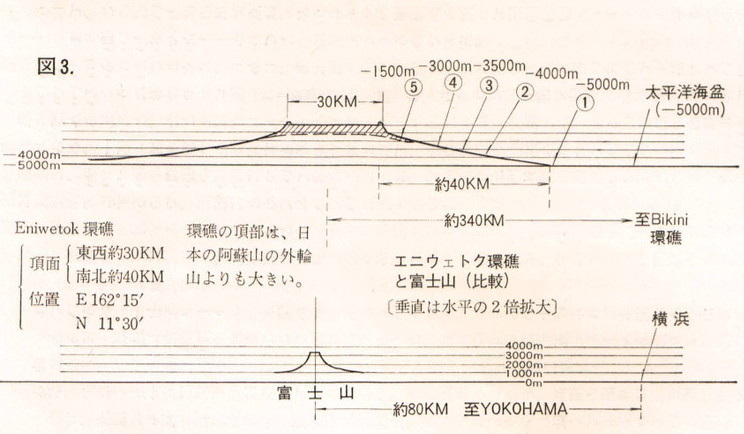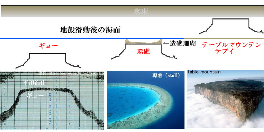 | 2723 Date: 2018-04-09 (Mon) チャールズ・ダーウインの環礁形成理論(定説)の矛盾(その2) コトバンクの解説によれば、ダーウィンが1842年に発表した環礁の成因説(裾礁→堡礁→環礁)が現在でも有力な定説であり、近年の調査によって裏付けられた、とあります。 ![]() アメリカの海洋大気庁(NOAA)のサイトにも、沈降説のアニメーションが載っています。 沈降説が正しいとはとても信じられませんので、反論しますが、先ずはコトバンクから紹介します。ーーーーーーーーーーーーーーーーーーーーーーーーーーーーーーーーーーーーーーーーーー 裾礁 サンゴ礁の一種。岸サンゴ礁ともいう。島または陸地の周縁に接して発達しているもの。その幅は砂浜のある緩斜面や風浪の弱いところで広く、磯の部分、風浪の強いところ、海水の濁りやすいところで狭い。サンゴ礁の発達段階の初期に相当するもので、次第に堡礁に移化すると考えられる。 堡礁 沖サンゴ礁ともいう。海岸からやや離れた沖合いに存在するサンゴ礁。基盤陸地の沈降または海面の上昇によって裾礁 (きょしょう) が変化したもの。沈降によって海岸線は陸側に移動するが、サンゴは上方にのみ成長するので両者は分離し、間に礁湖が形成される。オーストラリアの東北岸の沖合いには、約 2000kmにわたり大堡礁が発達している。 環礁 ドーナツ状に、中央部に島のないサンゴ礁。やや小高い部分もあるが、輪郭の大部分は海抜数m程度で、波で砕かれた岩片が打寄せられて現れた礁原が、環状を呈する。礁原の幅は 100mぐらいで、大波のときには礁原が洗われることもある。中央の礁湖はごく浅いが、礁原が切れた水道で外海と通じる。外海側の環礁の斜面は、かなりの深さまで 45°以上の傾斜のことがある。環礁はおもに太平洋南部とインド洋に分布し、大きなものは径が 60kmをこえるものもあり、マーシャル諸島に特に多い。 環礁の成因については、C.ダーウィンが 1842年に発表した説がある。ダーウィンは火山島のまわりの裾礁 (きょしょう) が沈降し、火山島から離れた堡礁となって成長し、中央部の火山島も海面下に没して環礁ができたと考えた。 近年の各地のサンゴ礁試錐調査や人工地震による調査で、この考えを裏づける資料が得られている。試錐ではフナフチ環礁が約 350mまで、ビキニ環礁が約 800mまで、全部がサンゴ礁などの石灰岩であることがわかった。 1960年のエニウェトク環礁試錐では約 1300〜1400m下に玄武岩が出て、火山島が確認された。一方人工地震による調査では、ビキニ環礁も約 1300mの深さに火山島があるとみられている。 ーーーーーーーーーーーーーーーーーーーーーーーーーーーーーーーーーーーーーーーーーーーーーーーーー プレート論を容認すると仮定して話を進めます。 定説では環礁とギョーの関係が説明されていませんが、火山島の沈降(プレートの移動による水深の増加のこと)よりも造礁サンゴの成長速度が早いから環礁になると考えているようです。したがって火山島の沈降速度が速いときにはギョーになるということになりますが、中央海嶺から同じような距離にある海底で、ギョーと環礁が共に存在することは矛盾があります。また、プレートに乗っているだけで島の形が平坦になることはありえません。 太平洋で考えればギョーは北西部に多く、環礁はその南に多く存在します。しかし、プレートの移動速度が太平洋の北部と南部で違うことは考えられませんので、沈降説には矛盾があります。 石田理論では[2718]で説明したように、氷床がなくなった環境下で、海面水位が何処にあるのかによりギョーと環礁とテーブルマウンテンの違いができます。 環礁は造礁サンゴが生育できる程度の深さなら、上方に成長して石灰岩が形成されるはずです。その規模が1000mを超えることが可能かどうかはよく分かりませんが、日本列島の伊吹山や秩父の武甲山のような例を考えれば、可能性はあるはずです。 太平洋にギョーや環礁が多いのは、極域がこの地域に長期間あり、氷床が広がったからです。最大規模のギョーがある天皇海山列付近(北部)にも、エニウェトク環礁のある地域(南部)にも極域が位置した時代があって、平頂火山を形成したはずです。 天皇海山列付近に在ったときはエニウェトクやビキニなどは赤道付近になったはずですから、活発な造礁活動があったでしょう。石灰岩が厚いのはそのためでしょう。 両地域で違うのは地軸が変化し、氷床が消えたときの火山頂部の水深の差です。エニウェトクの海山頂部は浅く、天皇海山の海山頂部は深いという差があると考えられます。 氷床下で形成された平頂火山がその後の地殻変動で隆起したり沈降したケースもあるでしょうが、基本的にはグランドレベル(地盤高)の高低と火山の規模(高さ)が三者(ギョー、環礁、テーブルマウンテン)の違いを決めたはずです。 なお、ギョー(平頂海山)についてはコトバンクで以下のように解説しています。 ーーーーーーーーーーーーーーー