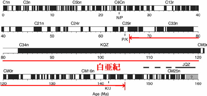 | 2718 Date: 2018-04-05 (Thu) 西太平洋のギョーは白亜紀に形成されたと推定される ギョーの多くが西太平洋に存在し、規模も大きいことを[2449]などでも述べました。その西太平洋のギョーが形成された時期は白亜紀であろうと[2717]で述べましたが、その根拠となる磁極の変化図を再掲します。