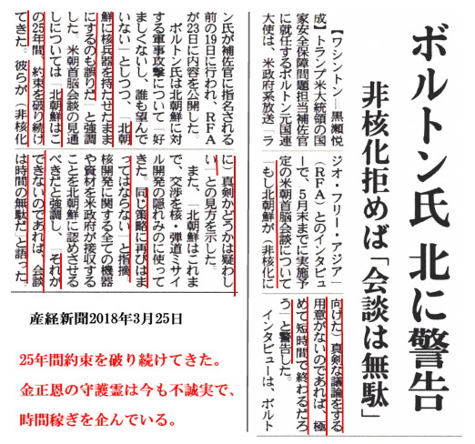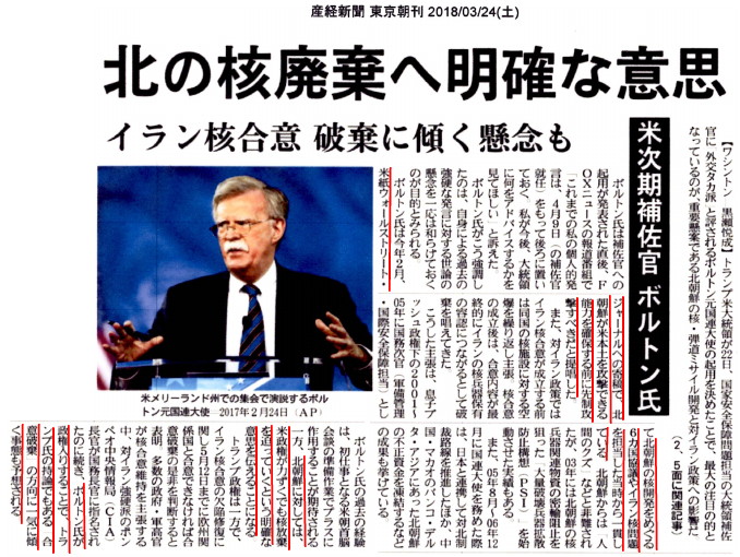 | 2712 Date: 2018-03-25 (Sun) 9年前から変わらない 時代錯誤の防衛意識 アメリカの次期大統領補佐官ボルトン氏はインタビューで北が非核化を拒めば「会談は無駄」と警告しています。