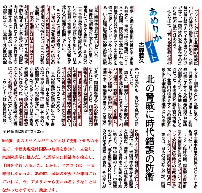 一方の金正恩守護霊は「非核化?あるわけないだろう」と述べ、トランプ氏の引退まで「時間稼ぎ」を狙っています。その間に文大統領に戦果があるかのような“偽りの平和統一”を演出し、その後暗殺する手だってある、とも述べています。 金氏の策略が通じるのか、トランプ氏やボルトン氏の冷徹な眼力が勝つのか、歴史の分岐点のような一年になるのでしょう。 ところで日本の防衛策がアメリカから見ていると「時代錯誤」に見えると小森義久記者が「アメリカノート」に載せています。