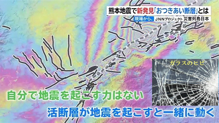 | 2733 Date: 2018-04-14 (Sat) 「地震村生活共同体」からは新しいものが生まれない 熊本地震で「おつきあい断層」が現れていたことが報道されています。 ![]() テレビの報道画面に“ガラスのひび割れ”現象を追加したもの ーーーーーーーーーーーーーーーーーーーーーーーーーーーーーーーーーーーーーーーーーーーーーーーーー 【現場から、】熊本地震で新発見「おつきあい断層」とは 震度7を2度観測し、267人が亡くなった一連の熊本地震が発生してから、まもなく2年を迎えます。2度目の震度7の地震では、メインの活断層以外に、200以上もの未知の断層がずれ動いていたことが人工衛星を使った最新の技術によって新たにわかりました。 熊本県益城町の畑には、熊本地震の本震=マグニチュード7.3の大地震の痕跡が、くっきりと残っています。大地を右方向に2.5メートル動かした断層の跡です。ただし、地震の際にずれ動いたのは、このように目に見える大きな断層ばかりではありませんでした。熊本地震の本震は、「布田川断層帯」と呼ばれる全国でも有数の活断層がずれ動いて発生したことがわかっています。ところが・・・ 「断層がたくさん、山ほど走っている」(国土地理院 地理地殻活動研究センター 藤原智総括研究官) 国土地理院による人工衛星を使った観測で、メインの活断層とは別に、地下では細かい線状の断層が、広い範囲でいくつも動いていたことが、わかりました。その数は、およそ230にのぼるといいます。 「これだけ多くの断層が、いっぺんに現れた。阿蘇カルデラだけでなく、熊本市内とかいろいろな場所に多く現れた。こんな例は初めてです」(藤原智総括研究官) 「『おつきあい断層』と呼んでいます。自分で動いたのではなくて、メインの断層におつきあいした断層」(藤原智総括研究官) おつきあい断層と一連の熊本地震の震源とを重ね合わせると、おつきあい断層のある場所で、必ずしも地震が発生しておらず、むしろ少ない傾向さえ見てとれます。 「ここですね、全く地震が起こってない」(藤原智総括研究官) 自分で地震を起こす力はないにもかかわらず、活断層が地震を起こした場合は一緒になってずれ動く、おつきあい断層は、そんな“受け身”の断層なのです。この亀裂は、おつきあい断層の影響を受けて生じたとみられますが、おつきあい断層が地上に直接、達するほど大きくずれ動いたり、強い揺れをもたらしたりした例は今のところ確認されていません。 「今回の熊本地震だけを見れば、(おつきあい断層の)ずれの真上でなければ、大した被害はなかったと思う。ただし未来永劫そうなのかは、調べないと分からない」(藤原智総括研究官) おつきあい断層は、一生おつきあいするだけで、自ら地震を起こすことは絶対にないと言い切れるのか。研究はまだ始まったばかりで、熊本地震で得られたこの新しい知見は、従来の活断層の定義や評価の方法にも一石を投じることになりそうです。(12日10:10) 最終更新:4/12(木) 19:38 ーーーーーーーーーーーーーーーーーーーーーーーーーーーーーーーーーーーーーーーーーーーーーーーーー 断層は地震という爆発現象の結果として現れることにまだ気付いていません。「おつきあい断層」なるものを調べて何の意味があるのか理解できません。 「自ら地震を起こすことは絶対にないと言い切れるのか。研究はまだ始まったばかりで、熊本地震で得られたこの新しい知見は、従来の活断層の定義や評価の方法にも一石を投じることになりそう」だとありますが、力学的には何の意味も無い「無駄な研」をやっています。 日本では、テレビで報道された人が大学に再就職して、政府の委員会などにも顔を出しています。「地震村生活共同体」からは、何も新しいものは生まれないでしょう |