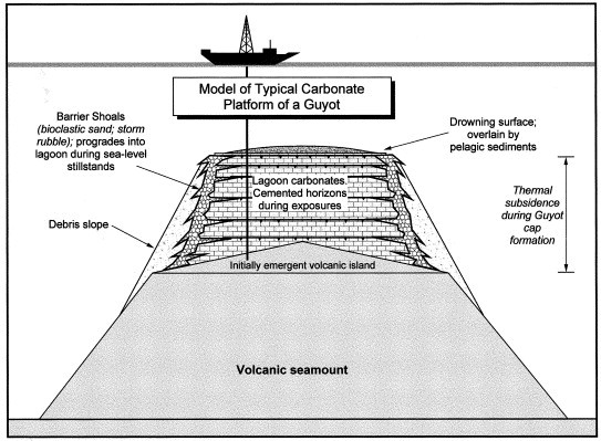 といって、ダーウィンの沈降論が正しいわけでもなく、ダーウィン海膨仮説が正しいわけでもありません。 西北部にギョーがあり、東南部に環礁が存在するのは、西北部の沈降が早く、深かったから、ではありません。 海底地殻の隆起や沈降は否定できません。地球物理学者は否定しますが、アトランティス大陸やムー大陸も沈降した可能性があります。 しかし、平頂海山は成層火山であることを忘れてはなりません。普通の海山が波蝕で成層になるはずがありませんし、切頭が進行中の海山も存在しません。さらに言えば西太平洋のギョーの頂部には円磨された玄武岩の巨礫が存在することも説明できなければいけません。([2595]参照) ダーウィンの沈降論もプレートテクトニクス論もギョーと環礁の成因を説明できないことを認識して頂きたいと思います。 ギョーとテーブルマウンテンは同じメカニズムで形成されています。環礁はさらにギョーの頂部に造礁珊瑚が発達したものです。[2718]西太平洋のギョーは白亜紀に形成されたと推定されるの図を参考にしてください。 |