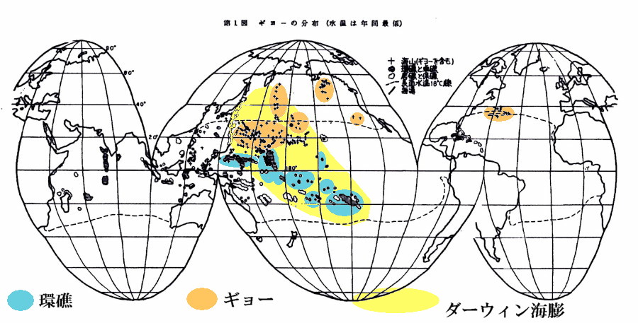 図にあるように、玄武岩の土台(ギョー)の上に珊瑚礁が発達し、一旦水面上に出て死滅し、平坦化され、再度復活、が繰り返されて連続していないようです。 結論は環礁が溺れる「ダーウィンポイント」は複雑でダイナミックで、よく分からないということです。 かように、ギョーと環礁の問題は複雑で現在も解決できていない問題です。しかし教科書的には簡単に、環礁が溺れてギョーになったとしてあります。(石田理論ではギョーは溺れたのではないとしています。) そこで、視点をがらりと変えて、 「閉ざされた水域(氷底湖)内での火山活動で水平な成層火山ができ、地軸の傾斜(または地殻の滑動)によってそれが地上のテーブルマウンテンにもなり、海底のギョーにもなった。また浅い海の場合にはギョーの上に環礁が形成された。さらに地殻の陥没があれば、環礁が沈下するので、さんご礁を載せたギョーがあっても不思議ではない」 という革命的見方を取りいれるのが石田理論です。さすれば、ダーウインの海膨仮説も沈降仮説も不要になります。 西太平洋のギョー頂部には玄武岩の大小の礫がありますが、極域に発達した氷河が運んだ氷河堆積物(迷い石)ということで謎は解けます。