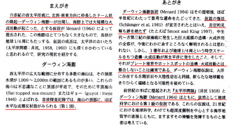 | 2731 Date: 2018-04-13 (Fri) ダーウィン海膨仮説は否定される ダーウインの“環礁沈降説”は“プレート論”と合わさってスマートな説明が可能になった、とされています。太平洋プレートは西方に移動するのに伴って深くなって、沈降したように見えるからです。 ブリタニカの解説を紹介します。 ブリタニカ国際大百科事典 小項目事典の解説 太平洋中央部に存在したといわれる約2億 2000万年前から 6500万年前の仮想的な海膨。サンゴ礁成因の沈降説 (南太平洋地域が広く沈降したとの学説) を発表した C.ダーウィンにちなんで W.メナードが命名。 ーーーーーーーーーーーーーーーーーーーーーーーーーーーーーーーーーーーーーーーーーーーーーーーーー 概略を図示すると次図のようになります。