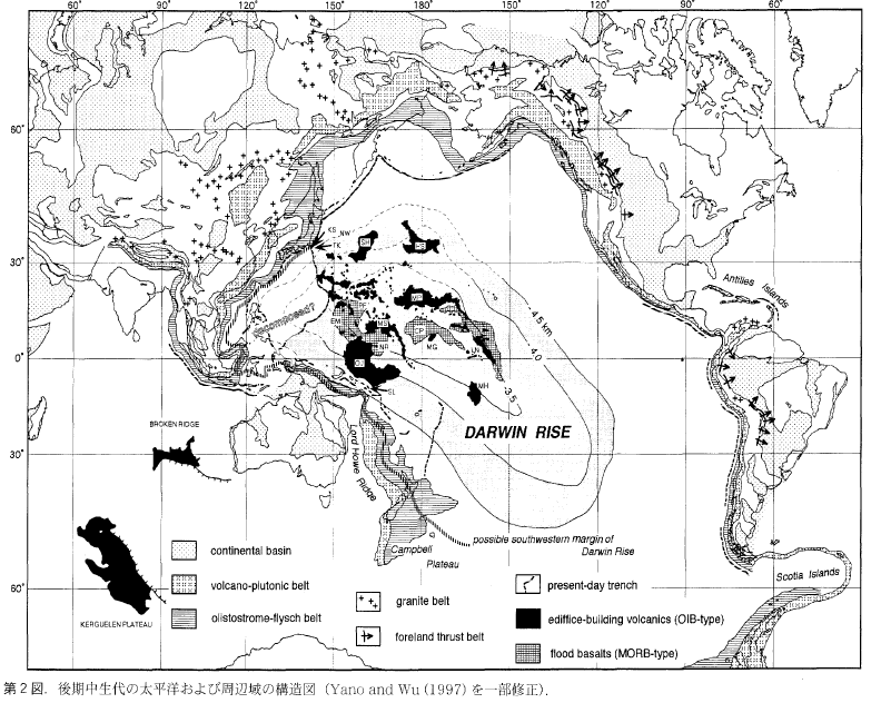 | 2732 Date: 2018-04-13 (Fri) 「太平洋の形成問題」を解く鍵は地震爆発論と石田理論にある ダーウィン海膨(DARWIN RISE)研究の現状と題する記事(著者矢野孝雄氏)が地球科学57巻(2003年)に載っていましたので「まえがき」と「あとがき」から紹介します。 次図はその論文に載っているダーウィン海膨を含む太平洋の構造図です。