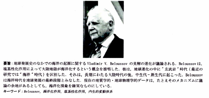 Beloussovはこのように、大陸域にとって代わって海盆が形成されたという決定的証拠を、入手できる地質データが提供している、と述べた。その過程で、沈降のみならず、固化した地殻は次のように著しい変化を被った: 2. 最近の発展 海洋化作用に関する考えの発展やそれに関連した問題を、この20数年以上にわたってたどってみるのは興味深いことである。なによりも注目すべきは、この期間に、海洋域に古期・大陸性岩石が広く分布することを裏付けるたくさんの新しいデータが集められたことである。Meyerhoff and Meyerhoff(1974)によると、大陸性岩石が全海洋の中でわずかながらも9地点から報告された。そのころ、そのような発見は珍奇なできごと―流氷によって運ばれたとする「氷河性の迷子石」、あるいは船舶のバラスト―として理解されていた(Platt、2000)。 世界の海洋における大陸性岩石に関するデータの概説がいくつか、NCGT Newsletterで公表されてきた。 2009年に、Yano et al、(2009)は、大西洋で発見された古期大陸性岩石の詳細な性質を細介した。そのような岩石は、大西洋の42ケ所で発見され、4つのタイプに区分された。2011年に、Yano et al.(2011)は、 インド洋の32ケ所で類似の情報を公表した。Vasilief、Yanoand Choi(2012)による論文で要約されたように、「大西洋の42地点とインド洋の32地点とを合わせて、古期大陸性岩石が世界の海洋の172地点で発見された。それらの中で、87地点から発見されたAタイプの岩石(大洋底の深さより深い大陸海洋遷移帯にある大陸牲岩石)は、大陸の一部が沈降して海洋底になったことを立証する。78地点から採取されたBおよびCタイプの岩石(中央海嶺と海盆にある大陸性岩石と大陸性の地球化学的特徴をもった岩石)は、海洋の大陸起源的特質を示している。 それらが大陸起源であり、岩石の古い形成年代が立証されたことは、海洋地殻が「0.2Gaより古い岩石、あるいは大陸起源のものは含まない」というプレートテクトニクスの主張に矛盾する。しかも「大西洋の地殻は1.85Gaの古い岩石を含んでいる」。「7地点から」発見された太古の岩石と化石は、「海洋リソスフェアの年代がそれぞれ、1.9Gaとオルドビス紀に遡ることを示している。さらに、上述の論文の他に、最近、同様の主旨の注目すべき2つの論文が公表された。 すなわち、James(2011)による「海洋下の大陸−どのくらいの大きさ、どのくらいの深さ?」とPlatt(2013)による「沈んだ大陸対プレートテクトニクス」である。 Platt(2013)が結論づけているように、「現在の海洋中に存在する大量の古代大陸地殻についての証拠がますます増え、それらはプレートテクトニクスへの著しく深刻な挑戦になっている」。プレートテクトニクスへのもう一つの同じ様に深刻な挑戦は、海洋地殻の玄武岩層の研究の結果として紹介されている。2011年にロシアの地質学者Bluman(2011)は『地球の海洋地殻』という本を出版した。この研究は、海洋の本質についての討論には欠くことのできない重要性をもち、海洋化作用を支持する研究であることが誇張なしに述べられているようである。 Blumanは、大西洋、インド洋および太平洋の第2層玄武岩に関する深海掘削のオリジナルデータを分析した。これらの文献では、玄武岩の一般的な性質がはっきりと規定されていて、彼はDSDP Initial Reportsを検討し解釈した。彼は、ほぼ全海域に分布する海洋底堆積物におおわれた第2層の玄武岩には、地表で風化作用を受けた痕跡をもつことを発見した。このことは、海洋性玄武岩は陸上環境で形成されたもので、それらの年代、構造、そして地層の基本様式は大陸性玄武岩と同じである」(Bluman、201l、p.330)ことを意味している。 Blumanの発見は、莫大な費用をかけた国際深海掘削計画の解釈が偏見に満ちていることを明確にした。つまり、「掘削コアの記載についての系統的研究は、深海掘削データがいろいろな点でプレートテクトニクスの教義と相入れないことを著者に確信させた。国家的・国際的論文に含まれるこのような矛盾についての情報の欠如は、世界の深海掘削の結果に対する現代の研究者の貧弱な認識の結果とみなされよう」(Bluman 2011、p.12)。 海洋地殻に関する新しいデータの出現は、つまるところ、海洋の起源と進化についての新たな見解の発展をもたらし、Beloussovの考えを明確に裏付けている。太平洋の構造と進化に関するVasiliev and Choi(2008 a and b)の研究に、まず最初にふれるべきである。太平洋における多数のドレッジの結果は、地殻の構造・組成は疑いなく大陸性であることを示した。そして著者らは、後生的に複合的構造−マグマ作用の支配下におかれたことを強調した。地質学一地球物理学的およびトモグラフィデータの分析は、三畳紀〜ジュラ紀に核から上昇した流動体によってもたらされた巨大なエネルギーの波によって太平洋が形成されたことを示している。低速度異常マントルの上昇は、地殻の構造・組成を変化させ、主要海盆の形成と造構−火成活動が続いた。こ