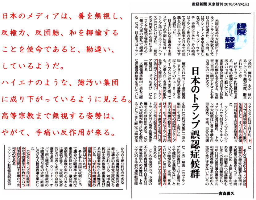 | 2741 Date: 2018-04-24 (Tue) メディアの誤認症候群・学生新聞から脱皮せよ 今日の産経新聞に「日本のトランプ誤認症候群」という記事がありました。