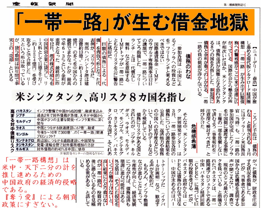 | 2750 Date: 2018-04-30 (Mon) 他国の自由を拘束しない「与える愛」外交 「一帯一路が生む借金地獄」という報道がありました。 スリランカでは港湾建設で、建設費を中国からの融資でまかなったものの、年6.3%の金利が重荷となって、結局中国国営企業にリース(99年間)することとなり、99年間という事実上は売却ということになりました。 こうやって中国は一帯一路を侵略しているのですが、参加国に危機感が希薄であることが問題です。
