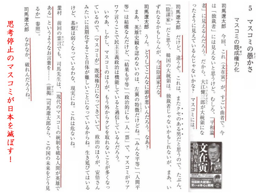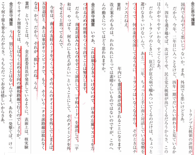 | 2745 Date: 2018-04-26 (Thu) 南北の首脳対話から平和を期待するのは全くの幻想である テレビでは「歴史的な南北の首脳対話」といって、平和が到来するかのようなワクワク感で見守っている節がありますが、金正恩の本音は以下に示すように、「時間稼ぎ」「日本の憲法改正阻止」であることは明白です。 ![]() 3月8日に緊急収録、かつ緊急出版された「文在寅vs金正恩」守護霊霊言p148、p.170より 左翼マスコミを力づけるための材料?モリカケ日誌? 「モリ・カケ・日誌」は誰が言い出したのでしょうか。 「最後の手だったら文在寅を統一朝鮮の大統領にしてもいい、とか、持ち上げて・・・・最後は暗殺したっていいし・・・、」と嘯いています。平和の到来などまったくの幻想です。 日本に対してはカンダハールの言葉かと思うような言い分「早く降参しろよ、核兵器を持っている方が勝ちだよ」といっているのを知ってください。 マスメディアは『政権交代は歴史の要請』とか言って、民主党政権を作りましたし、吉田清治に「ウソ証言」させた朝日新聞は「安倍政権打倒は朝日の社是」とか言って、国家衰退に尽力してきました。 今また、こぞって隣国の工作に嵌って「憲法改正阻止」の操り人形になっています。そうではないとしたら、「知力」が限りなく弱くなっているとしか思えません。 東大の地震学者も、NHK、朝日新聞をはじめとするマスメディアも、エリート層といわれる高学歴者のグループも、『挑発』でもなんでもなく、本当に『知力』が使い物にならなくなってきています。 社会的なリーダーを降りてください! 眼を覚まさないと、核を持った統一朝鮮が誕生し、日本を狙ってきます。 次回国政選挙があれば、誰が真なるりーダーとして相応しいのかを考えなければ、国家滅亡の危機を迎えることになると思います。 |