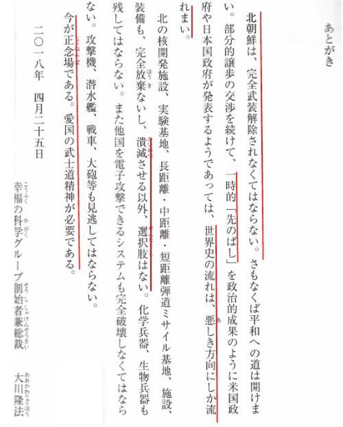 霊言書の著者である大川総裁はあとがきで、「「先のばし」では世界史の流れは、悪しき方向にしか流れまい。今が正念場である」と語っています。