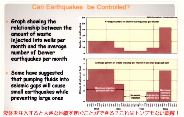 | 2782 Date: 2018-05-26 (Sat) 廃液の地下注入は危険・デンバーの注水実験から分かる筈だが 11年前にこのセミナー([1256])でデンバーでの注水実験から「地震エネルギーを小出しにできる」という発想を示された竹内均先生の「地球は半熟のゆで卵」の記事を紹介しました。 当時から、これは「地震爆発論」から見ると危険な発想である、とコメントしてきました(その後も何度も)。 ところが、同じ発想がアメリカの地震学教育版のようなサイトWhat are Earthquake?に現在も載っていました。スライドのタイトルは「地震をコントロールできるか?」となっていますから、「如何にして断層を少しずつ滑らして、調節するか」というところに視点があるようです。」 ![]() 「液体を圧入すると大きな地震を防げることを示唆している」とありますが、 今まで地震など起きなかった場所で起きているのは 新たに地震を起こしていることを意味します。 アメリカの地震学者は 「ほとんどの廃水は、「アーバックル地層」と呼ばれる岩の層へ注入される。すると、さらに奥深くにある地震を引き起こす基盤岩の層に水圧が伝わる。注入される水の量が増えるほど、ただでさえストレスがかかっている断層の間隙水圧がますます上昇し、通常はしっかりと固く接着している断層面が滑りやすくなって、地震が発生するのだ。」とか、 「廃水の注入や小規模の誘発地震が、より大きな地震を誘発してもおかしくない(USGS)」 と指摘する程度で、廃液注入が地震そのものの原因になっていることが理解できていません。(参考:米オクラホマ州で人為的な地震が増加-米地質調査所が地震危険度マップを発表。誘発地震の原因は天然資源採掘) 地震爆発論そのものをアメリカにも教えてあげるべきですが、竹内先生の弟子筋はまったく路線変更できません。 アメリカの地震学会会長を務めた安芸敬一、ニュートン編集長だった竹内均などの有名な日本人地震学者は、あの世に帰って何を思うのでしょうか。 「人為的に地震を起している」ことになります。