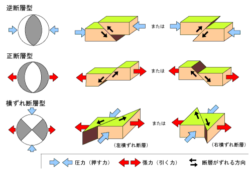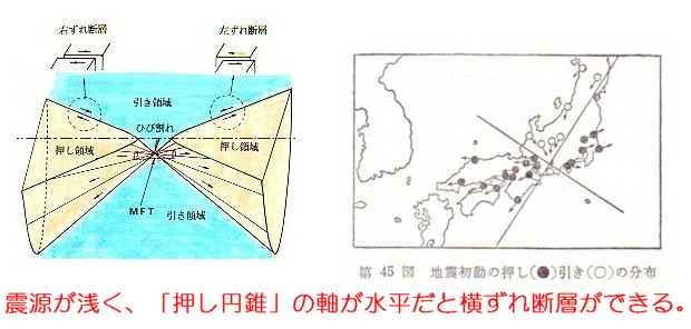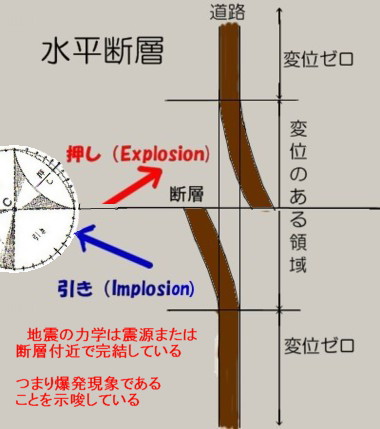 「押し引き分布」は「押し円錐の発生状況」によって変化しています。つまり、爆発(Explosion)と爆縮(Implosion)の位置関係で決まります。 土井氏監修の本では日本海に「左ズレ断層」が発生したとして、押し領域と引き領域の関係を以下のように解説しています。本当は共役関係にある「右ズレ断層」も説明すべきですが、無視しています。 「動いた岩盤の進行方向にある地震計には押しが、後ろのほうにある地震計には引きが記録されることになる」 とありますが、あまりにバカバカしい説明で、地震学の素人でも意味が理解できません。 [2300]で解説した、熊本地震で見られた「共役」あるいは郷村断層vs山田断層のような「共役」関係にある水平断層が出現するケースの話です。 石本先生の後輩に当たる地震学者たちには先輩が考えた素晴らしいアイディアが理解できないようで、「共役断層」という言葉さえ、死語にしたり、意味を変えたりしてしまいました。 日米ともに、否世界中の地震学者が「断層が動くことが地震現象である」という「狂信的信仰」に陥ってしまっていますので、“押し引き”の意味さえ分からなくなっています。 押しをTensionとか引張り(軸)とし、引きをCompressionとか圧力(軸)としているのは、物理現象から乖離しています。地震時に突き上げられるような衝撃(Explosionnによる衝撃)が押しですし、ストンと落ちるような衝撃(Imolosionによる衝撃)が引きであることから考えても、地震学が「物理学音痴」「力学音痴}になっていることが分かります。 全ての断層は、地震の傷痕にすぎません。 死んだ断層(地震の化石)というべきです。 There are no living faults (active faults). All faults are just scars of earthquakes. It should be a dead fault (an earthquake fossil). |