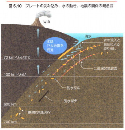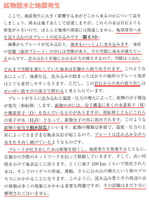 重要なのは、最初の破壊スベリがどうしておきるのか、ということですが、その説明はありません。 SF小説を読んでいるような錯覚に陥ります。 もう一つ鉱物脱水と地震発生(p.92〜p93)では、岩石から水が絞り出されて、巨大地震を促進し、70km〜100kmの間を循環しているという話があります。その先は鉱物が変化(相転移)して脱水反応が起きるとあります。 ![]()