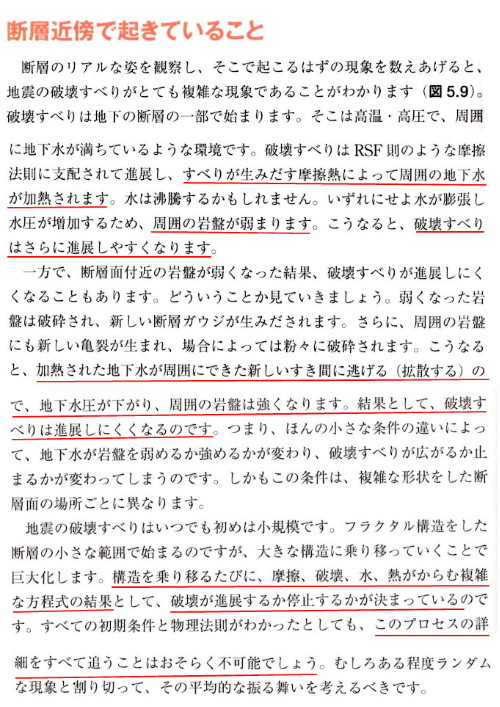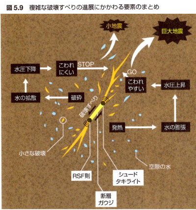 | 2788 Date: 2018-06-02 (Sat) 何もわからない・ 書籍「絵でわかる地震の科学」 「絵でわかる地震の科学」の中に断層近傍で起きていること(p.88〜p.91)という一節があり、読んでみましたが、ここにも因果関係の矛盾する記述がありました。 破壊スベリが最初にあって、水の膨張や拡散があり、膨張すれば「こわれやすい」、拡散すれば「こわれにくい」、というのは因果関係が逆転していて論理が矛盾しているのではないでしょうか。 ![]()