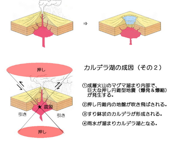 | 2780 Date: 2018-05-24 (Thu) カルデラやカルデラ湖ができる二つの地震爆発 キラウエア火山には巨大なカルデラがあり、その中にまた中小のカルデラがあります。[2778]の考察から、キラウエアでは引き円錐型陥没によって形成されるのだろう、という推察はつきます。 ところで、カルデラについて調べてみるといくつかの分類がしてあります。コトバンクから紹介します。 火山活動によって火山体に生じた凹地。噴火時にできた火口とは区別され、火口よりも大きい。スペイン語で大鍋の意味。内側は急崖で、外側は緩斜面からなる。爆発カルデラ、陥没カルデラ、浸食カルデラに分けられるが、大部分は陥没カルデラである。爆発カルデラは、大水蒸気爆発によって山体上部が崩壊して形成されるもので、馬蹄形になる (磐梯山、ベズビオ火山など) 。陥没カルデラには、クレーター・レーク型 (十和田湖、支笏湖、屈斜路湖など。) 、キラウェア型などがある。浸食カルデラは、火口壁またはカルデラ壁の浸食、崩壊によって、噴火口やカルデラが拡大したものをさす。日本は狭い国土に比してカルデラが多く、阿蘇カルデラ、姶良(あいら)カルデラなどは長径 20km以上で、世界最大級である。 カルデラ湖についても紹介します。 カルデラ湖 カルデラに湛水した湖沼。カルデラ湖の第1の特色は、非常に深い湖が多く、火口湖に比べてその規模もはるかに大きいことである。アメリカ合衆国オレゴン州にあるクレーター湖は最大水深 592mをもつアメリカ第1位の深湖である。日本では田沢湖(423m)をはじめとして、支笏湖(360m)、十和田湖(327m)、池田湖(233m)、摩周湖(211m)など第5位までの深湖はすべてカルデラ湖である。第2の特色は、湖水が栄養塩類に乏しく、プランクトンの成育が貧弱な貧栄養湖が多いことである。しかしこのことは、透明度の高い澄んだ湖が多いということにも通じる。摩周湖の透明度は 20m前後で、ロシアのバイカル湖とともに世界で最も透明度の高い湖の一つである。 興味を持ったのは、カルデラには陥没型と爆発型があること、カルデラ湖は深く、湖の縁が急峻であるという事です。 陥没型と爆発型を代表するような例が洞爺湖と倶多楽湖です。 ![]() コトバンクでは爆発型は水蒸気爆発が原因としてあり、陥没型は特に成因について解説してありません。 爆発型は「押し円錐型爆発(地震)」が発生したときに形成されるのではないでしょうか。(コトバンクに載っている図面(小学館 日本大百科全書(ニッポニカ)を拝借し、加工作成しました)